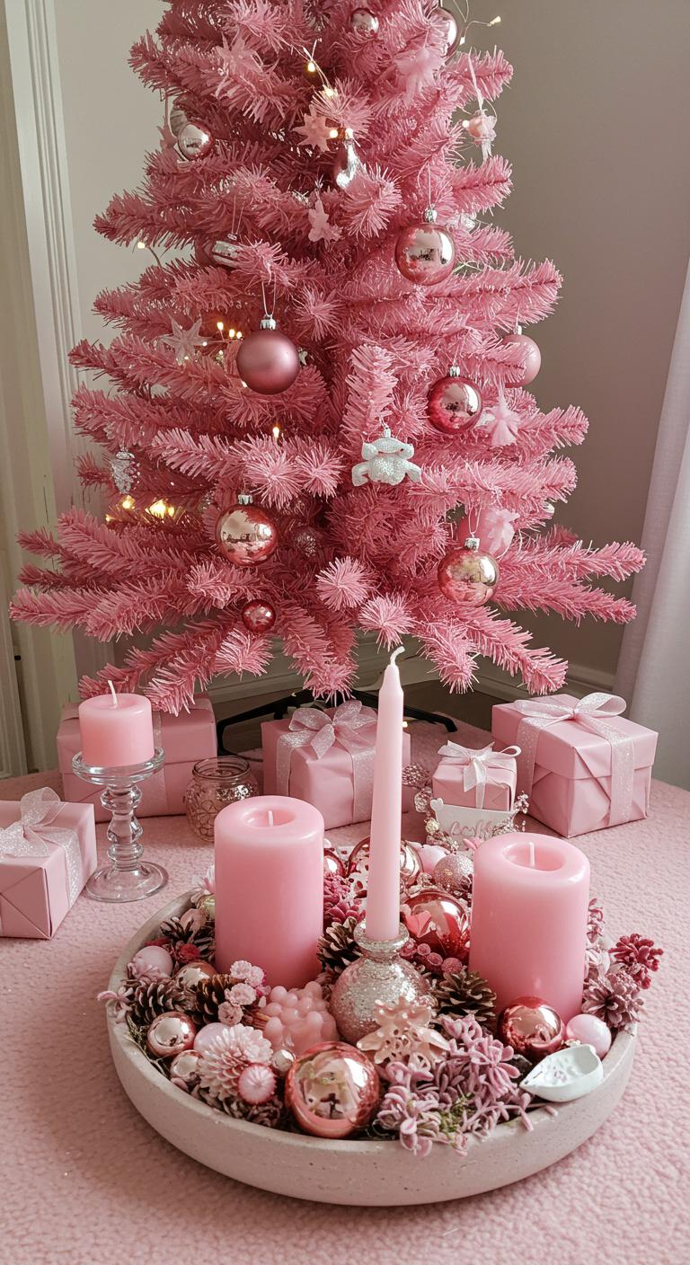 Create lovely pink-themed centerpieces to complement your Christmas tree. Use candles, ornaments, and greenery in similar colors. Gather items on a stylish tray or festive tablecloth. Even simple mason jars filled with pink accents can enhance the look. You can collect natural elements like pinecones, spray-paint them pink, and integrate them. Small touches like this unify the décor and ensure everything feels festive.
