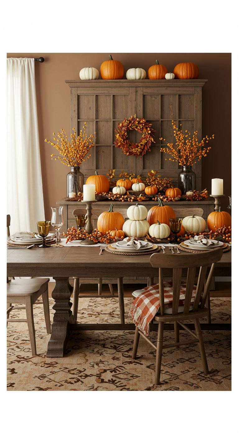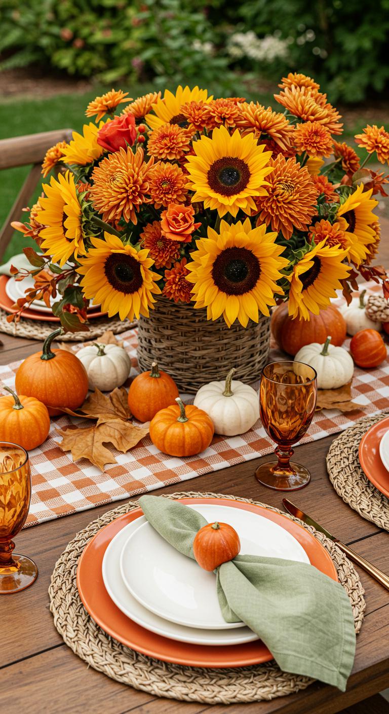 Coordinating orange and white plates on woven placemats further elevate the design. With checked fabric runners and rust or sage napkins, these centerpieces reflect innovative trends in seasonal decor, inviting guests to gather around a table that celebrates the essence of autumn’s charm.