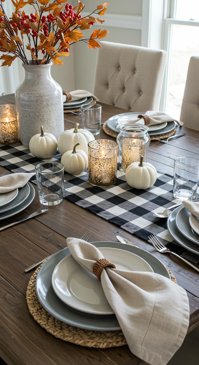 Embracing minimalist aesthetics, a buffalo plaid table runner in bold hues can serve as a striking foundation. Neutral tables paired with simple gray or white dishes evoke warmth, while beige napkins add a touch of sophistication.