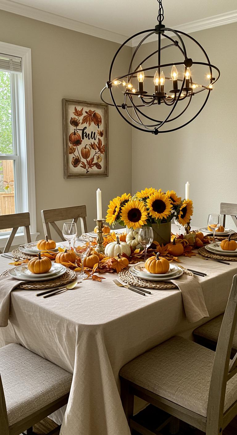 Layering textures not only creates a cozy atmosphere but also sets the stage for more elaborate fall dining table ideas that embrace the season’s charm. Incorporating warm, neutral tablecloths alongside vibrant sunflowers and scattered small pumpkins enhances the festive spirit.