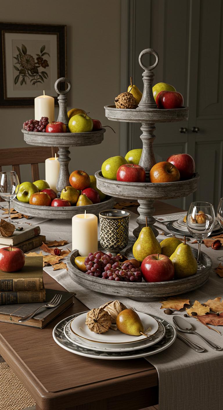 Utilizing tiered trays adds height and visual interest, beautifully showcasing candle arrangements that flicker invitingly. Seasonal fruits, like vivid apples and pears, can be artfully arranged alongside vintage books and heirloom pieces, creating a nostalgic yet fresh display.
