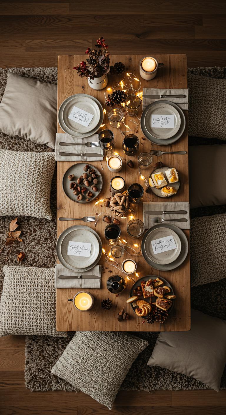 A thoughtfully arranged table adorned with soft textiles, like knitted throws and cushions, enhances the inviting atmosphere. Warm lighting from string lights casts a gentle glow, while seasonal elements such as acorns and pinecones add a touch of nature.