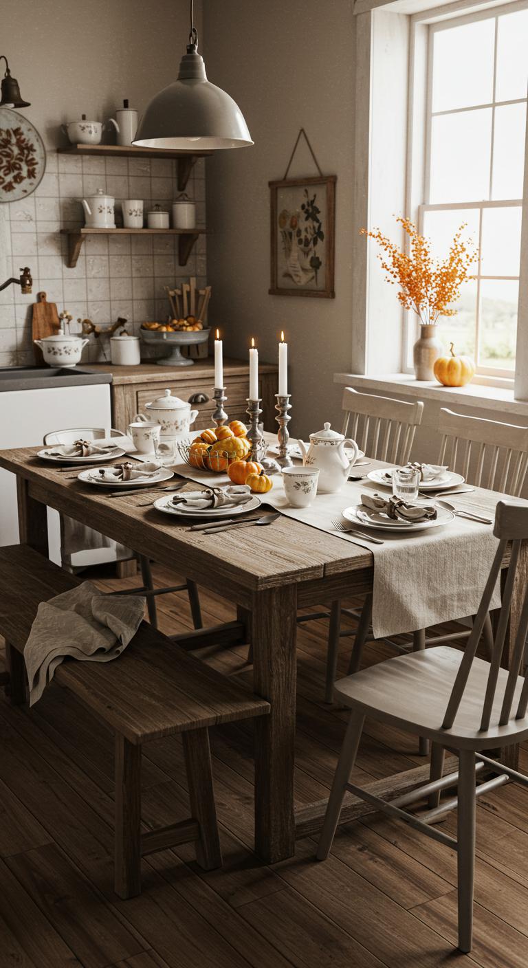 How can a rustic vintage kitchen evoke warmth and nostalgia while serving as a gathering space for family and friends? This style embraces natural wood, showcasing a stunning grain with a sturdy dining table as its centerpiece. Vintage tableware complements the aesthetic, featuring delicate patterns that tell stories of the past. Cozy benches or matching chairs enhance seating, inviting loved ones to linger. Simple fall decorations, like small pumpkins, add a seasonal touch. Rustic textiles, such as linen napkins and woven placemats, introduce rich texture, while candlesticks cast a warm glow, creating an atmosphere perfect for cherished memories.
