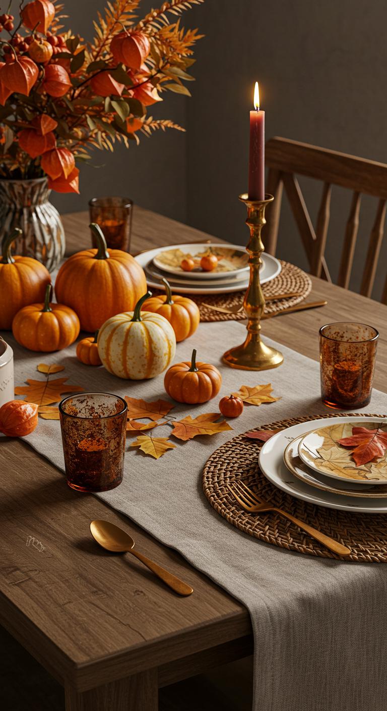 A carefully curated autumn color palette of deep oranges, browns, and muted greens creates a grounding atmosphere. Linen table runners flow softly across wooden surfaces, while small pumpkins in varying sizes add character and charm.