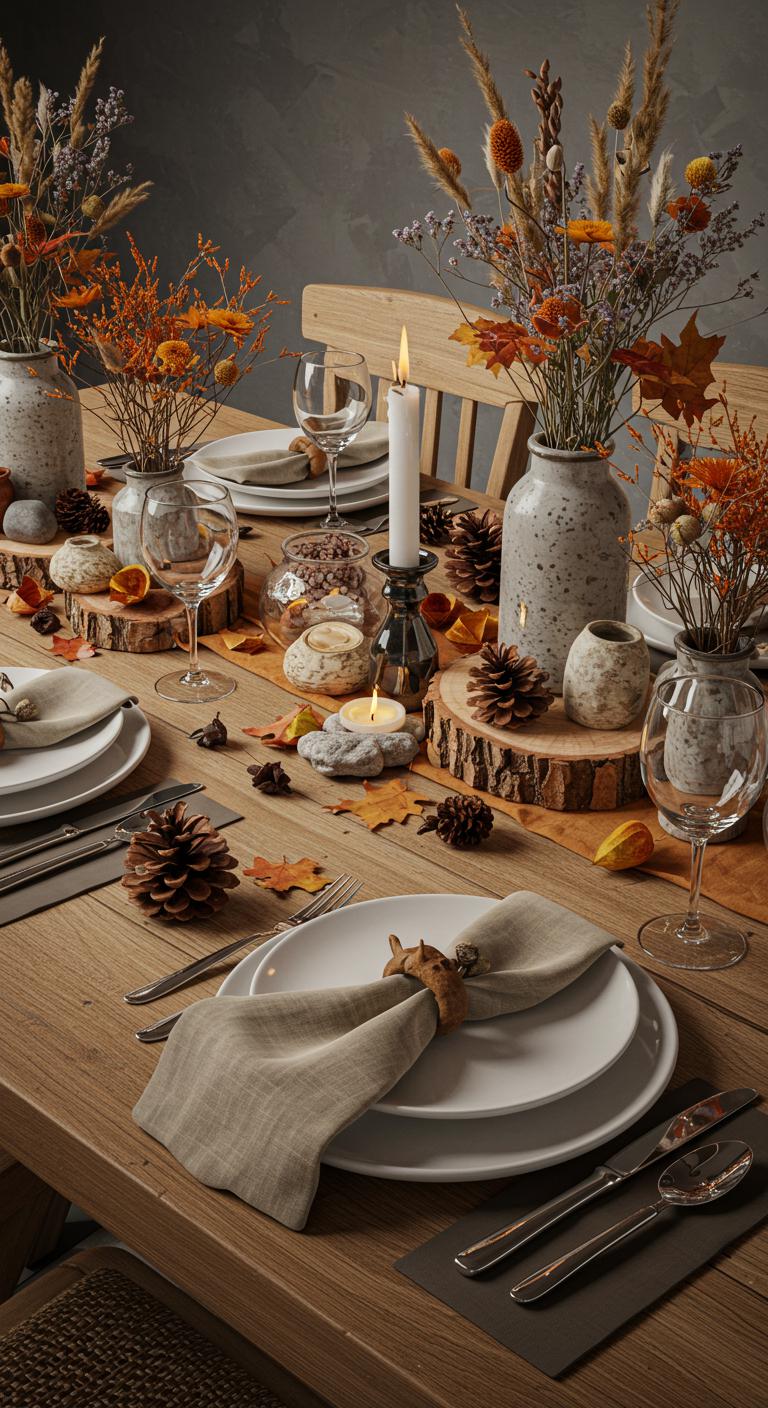 Natural elements in decor breathe life into autumn settings, transforming tables into showcases of rustic beauty and organic charm. The use of natural materials, such as wood and stone, complements an earthy palette, while organic accents enhance the ambiance.
