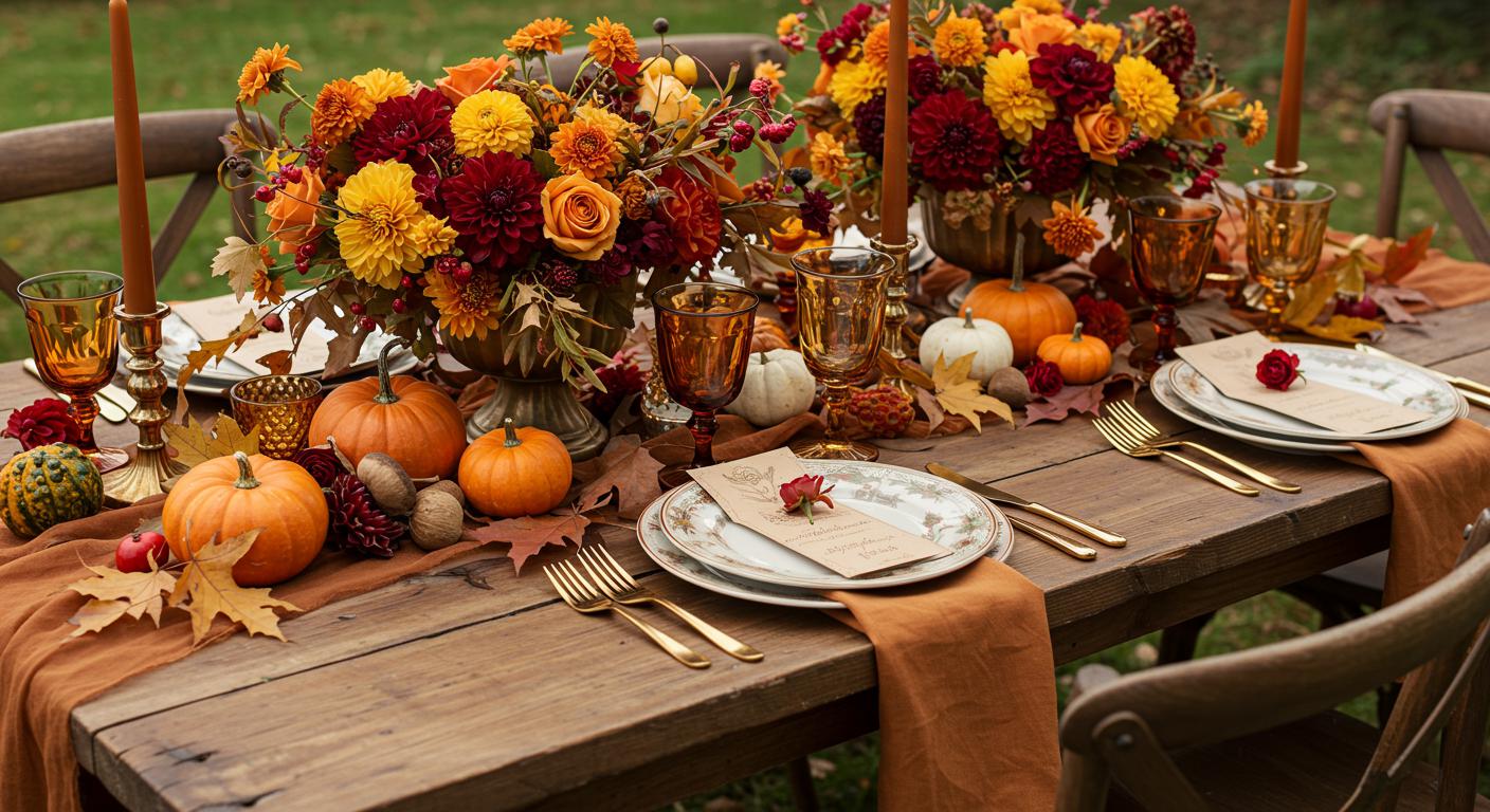 Vibrant autumn floral centerpieces breathe life into any dining table, showcasing the rich colors and textures of the season.