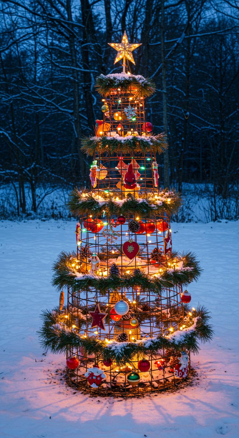 Creating a tiered tomato cage tree is simple and effective. Start with a few tomato cages and a string of lights. Stack the cages from largest to smallest, securing them in place. Wrap the entire structure in lights for a glowing effect. You can add greenery, ornaments, or bows to personalize your design. For a sturdy build, stake them firmly in the ground with garden stakes. This project allows for various sizes, so you can easily adapt it to fit your space.