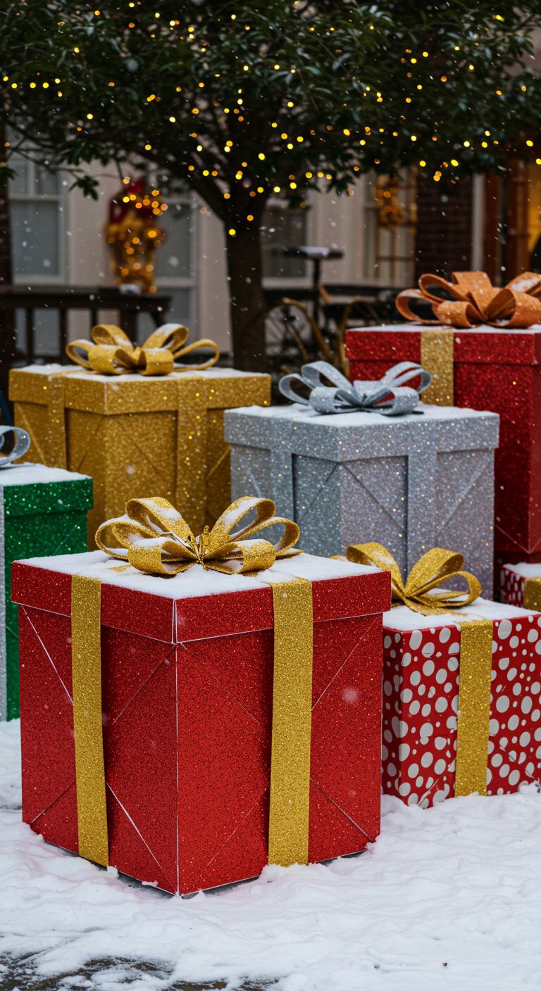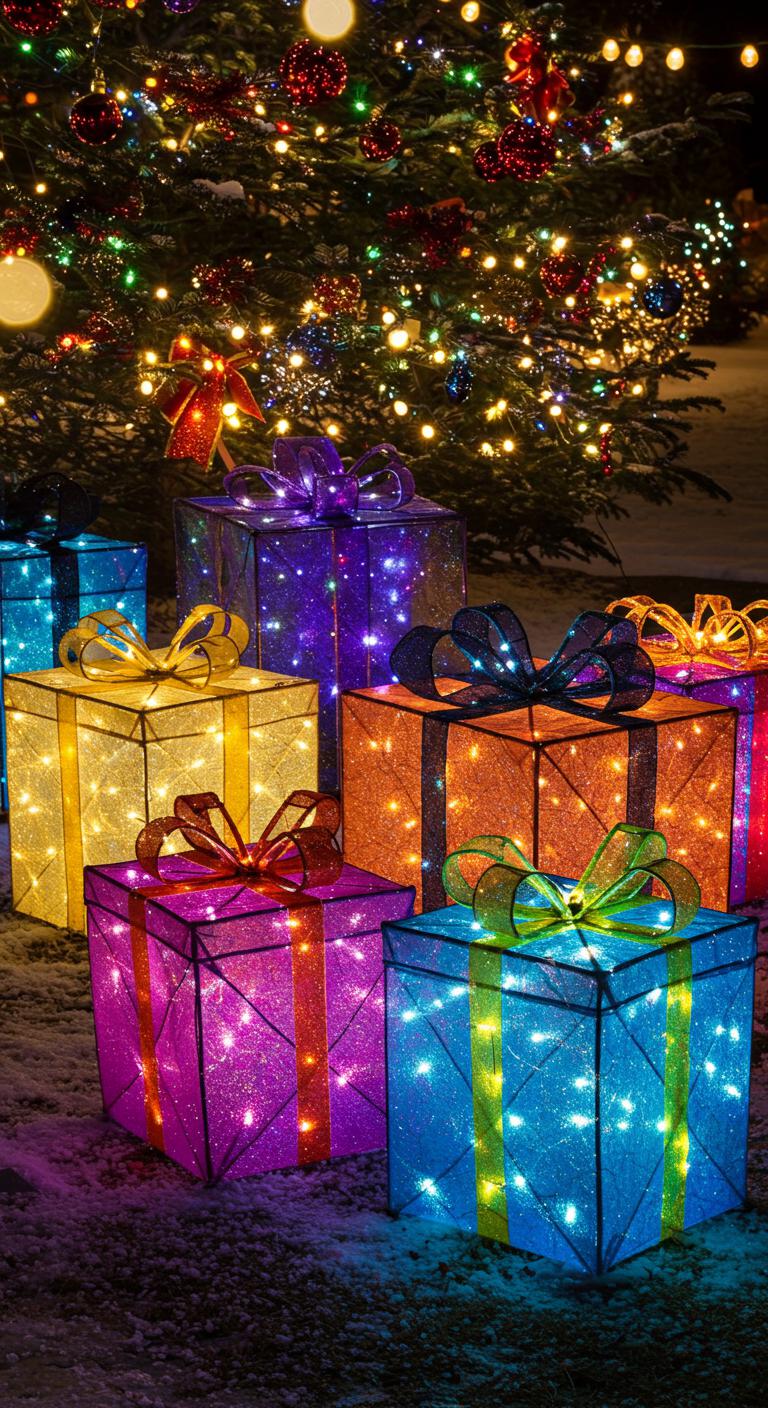 Customizable gift boxes can light up your yard beautifully. Use cardboard boxes to create your gifts, covering them with festive wrapping paper. Insert string lights inside and secure the boxes. They’re simple to make and can be adapted for any theme or color scheme. Place them near your walkway or porch for guests to admire. Unique designs go a long way in conveying your holiday spirit!