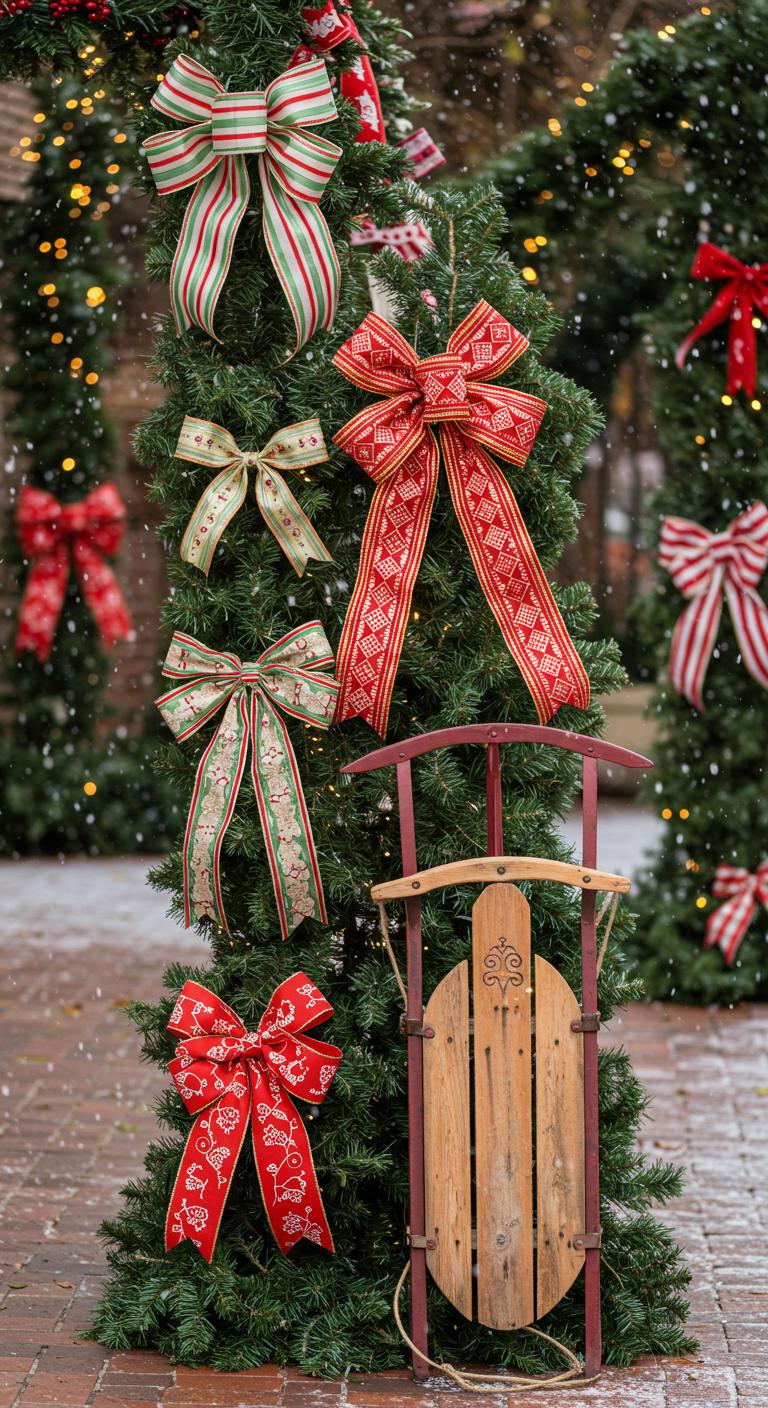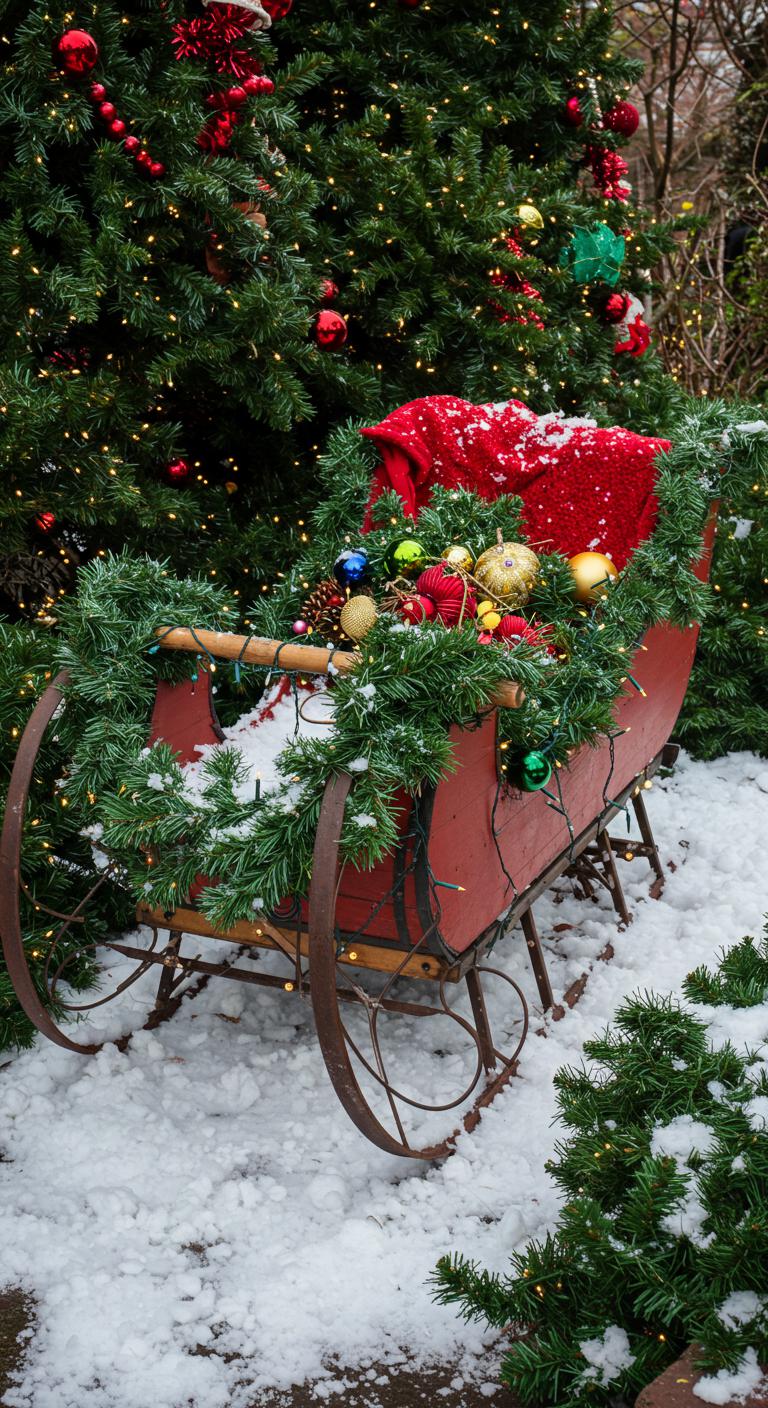 Use an old sled as a stylish display in your yard. Clean it up or paint it in festive colors if desired. Use wire or twine to attach ornaments, ribbons, or garlands that complement your other decorations. This classic element brings a sense of joy to outdoor decor. Position it near your front door or in the yard. It’s a great way to recycle items and add character to your space.