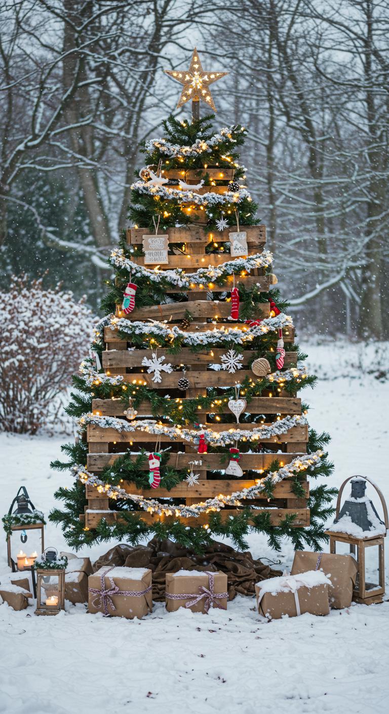 Make a festive pallet Christmas tree with minimal cost! Find a wooden pallet and cut it into a triangular shape. Sand down any rough edges to ensure safety. Use screws to attach branches or logs sideways as branches. Paint it green or stick to a natural wood finish. Decorate it with lights and ornaments for extra flair. This sturdy decoration will add uniqueness to your yard and can be reused in future seasons.
