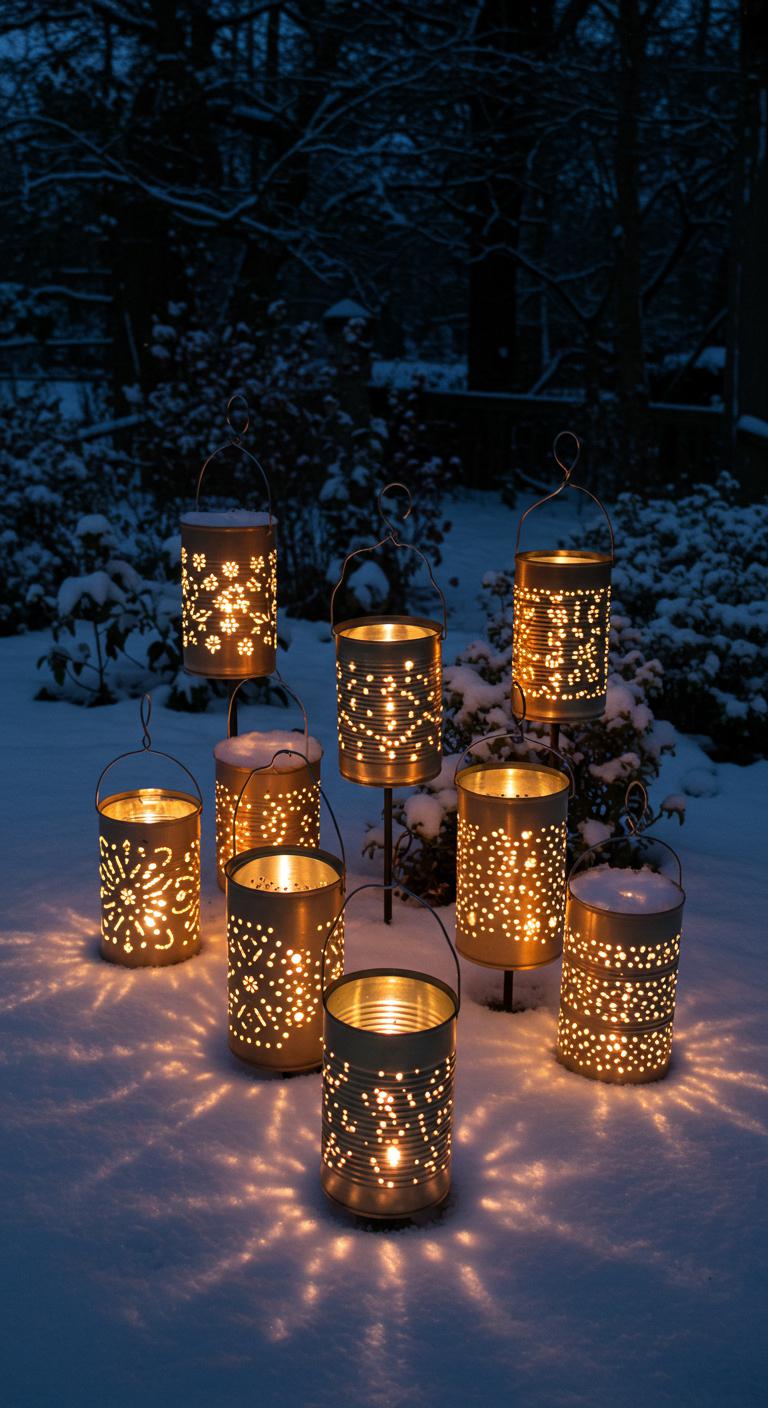 Recycled tin can lanterns make for fun and sustainable decorations. Start by cleaning out some old tin cans. Fill them with water and freeze overnight. The ice will keep the can firm while you punch holes for designs. Once done, allow the ice to melt and remove it. Place a candle inside, and you have unique, glowing lanterns for your patio or porch. They can add charm and warmth to any holiday gathering.