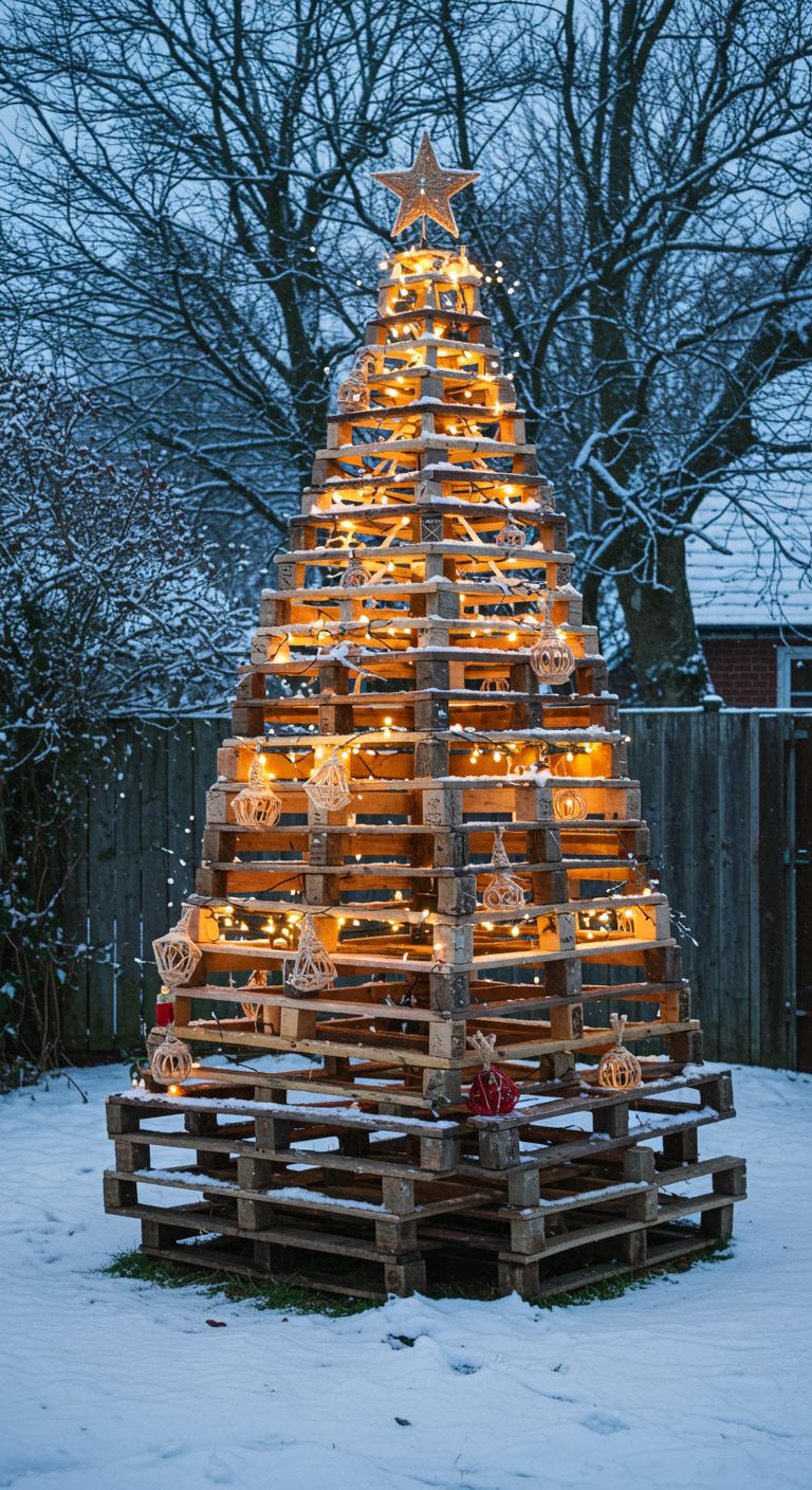 Creating a Christmas tree from wooden pallets is both budget-friendly and stylish. Start by sourcing free pallets from local businesses or home improvement stores. Stack and secure them in a triangular shape. To decorate, you can paint it or leave it natural for a rustic look. Add LED lights for a magical glow at night. Personalize it with ornaments made from pinecones, ribbons, or thrift store finds. This tree serves as both a statement piece and a great conversation starter for your holiday gatherings.