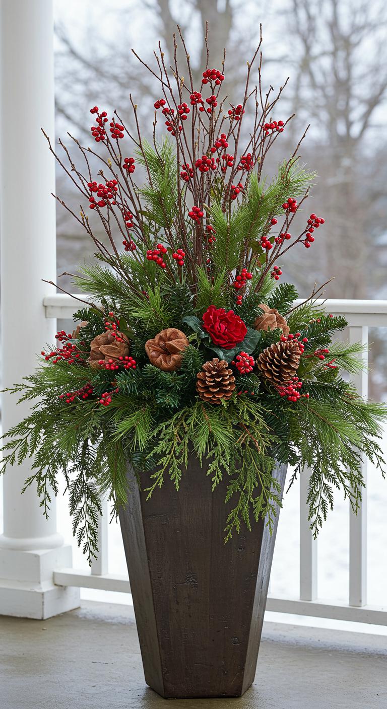 Create seasonal arrangements in planters to enhance your home’s curb appeal. Fill containers with evergreens, red berries, and decorative branches. You can use inexpensive pots from discount stores and add a splash of paint to personalize them. Display these arrangements on your porch or by entryways. This project is low-cost and greatly improves the festive spirit of your outdoor space.