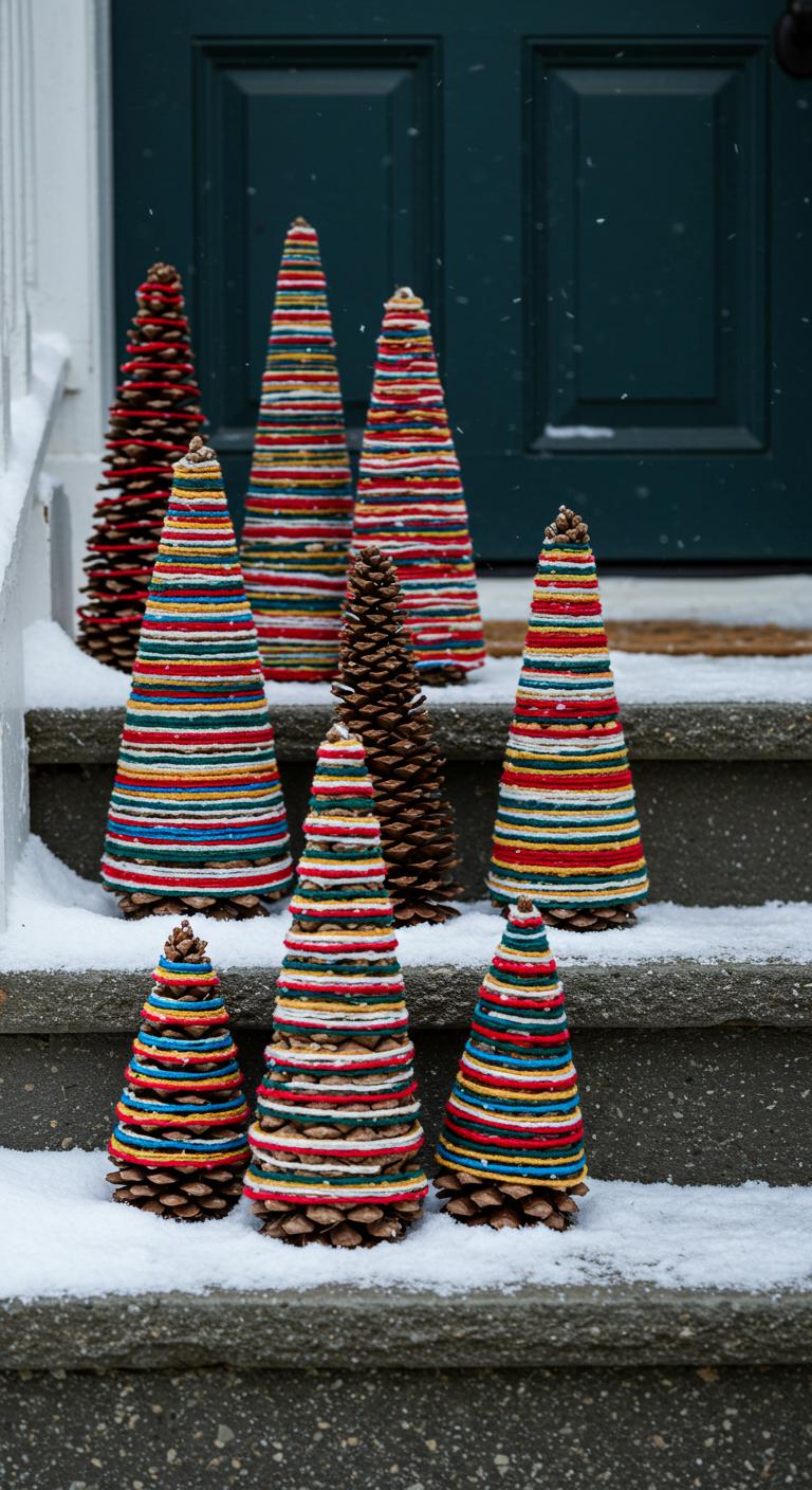 Transform simple cones into festive decorations with colorful yarn. Collect cones from your yard or purchase foam ones from craft stores. Wrap them tightly in yarn; use shades of red, green, and white to evoke holiday colors. Display the finished products on patios or entrance steps. This affordable project is easy to tailor to your personal style. Plus, kids love helping with this craft!