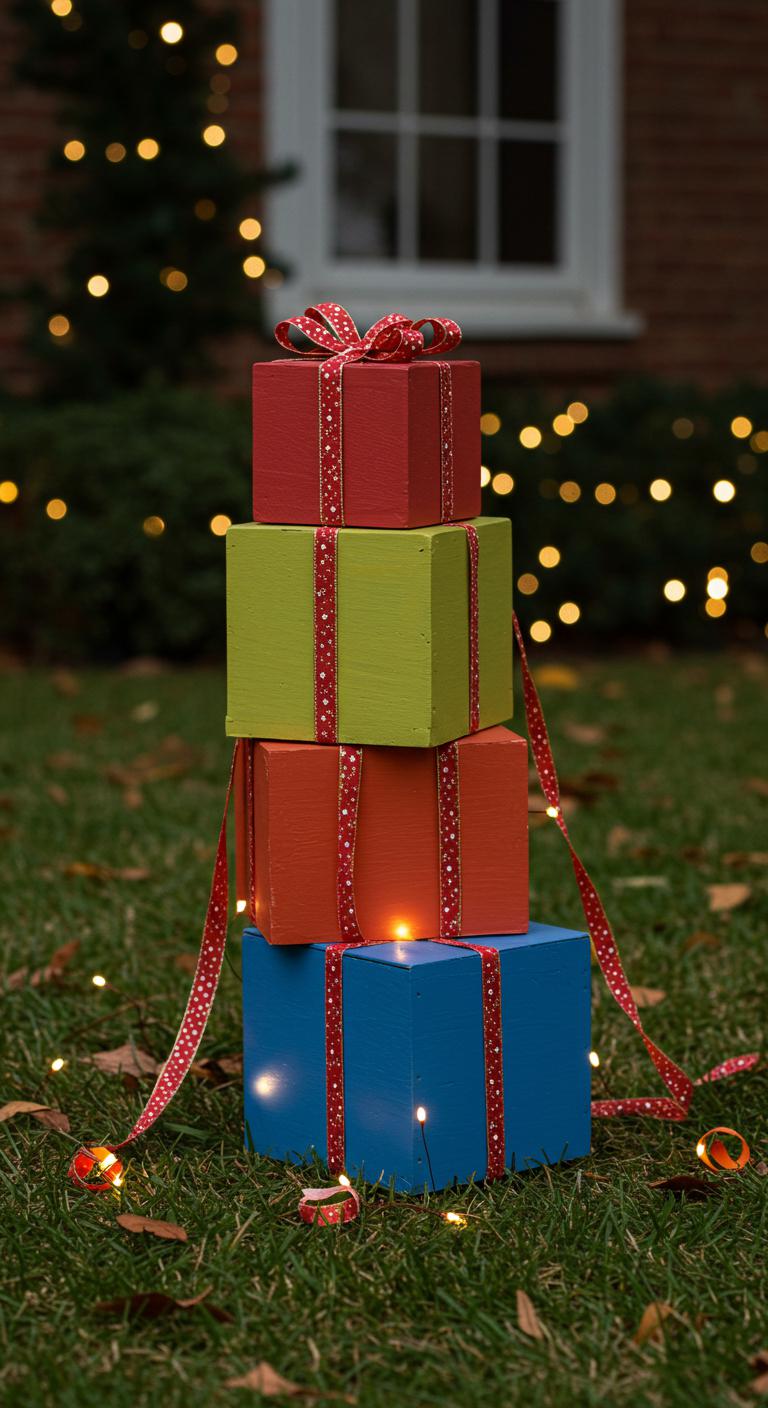 Wooden frames filled with colorful mesh fabric can be fashioned into festive gift boxes. Create frames using scrap wood or old crates, and cover them with mesh ribbon in bright colors. You can fill them with lights or even use them as planters. Arrange them around your outdoor space for a vibrant look. This project is easily adjustable in size and color to match your holiday theme.