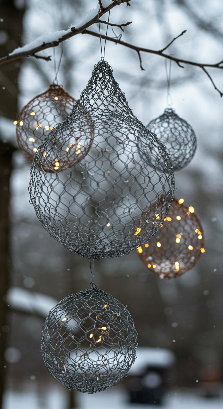 Utilizing chicken wire is a unique way to create airy holiday ornaments. Fashion the mesh into star or snowflake shapes. Place a strand of lights within and hang them from trees or around your porch. This project can add a modern twist while remaining budget-friendly. The transparent structure casts beautiful shadows during the evening. A little spray paint can add color to match your theme.
