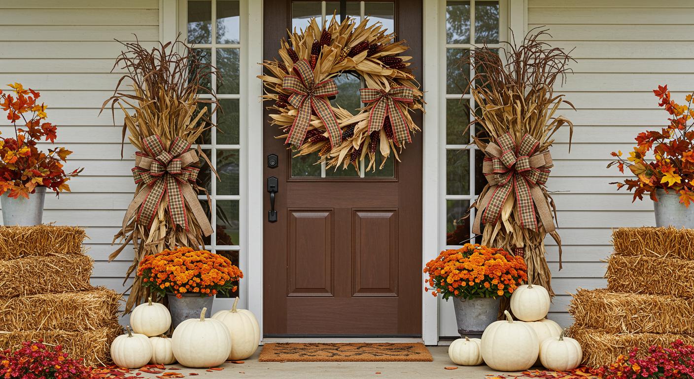 A charming corn husk wreath adorned with a vibrant orange bow captures the essence of autumn, offering a warm welcome to any front door. This rustic decoration pairs beautifully with pots of seasonal mums in bold yellows and oranges, enhancing the overall autumnal ambiance. For a striking contrast, this wreath looks stunning against a blue front door, creating visual interest. Grouping the display with white and orange pumpkins on a buffalo check mat adds a cozy touch, inviting visitors to experience the charm of fall. Together, these elements create a delightful entryway that embodies the spirit of the season.