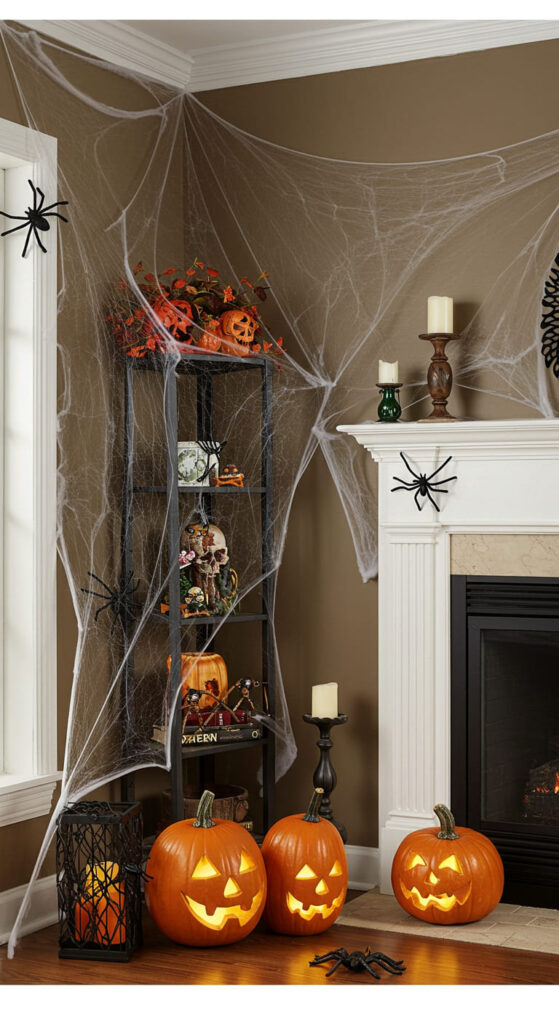Jack-o-lanterns can elevate Halloween decor to a new level of spookiness, especially when placed behind mesh drapes for a hauntingly beautiful effect.