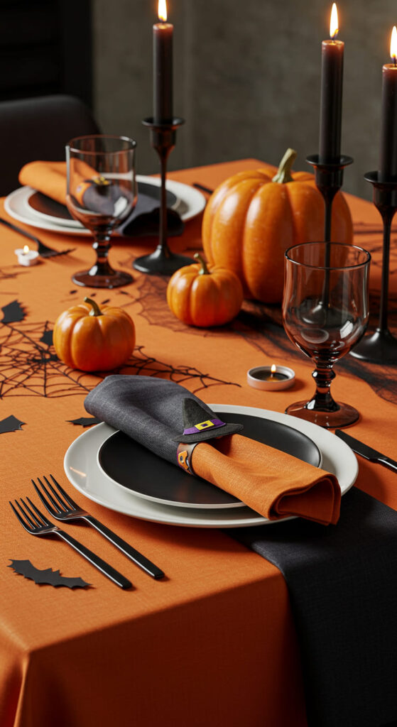 Incorporating table centerpiece ideas like small pumpkins or flickering candles can instantly elevate the dining experience. A vibrant tablecloth in shades of orange, black, or purple sets the mood, while festive napkin folding techniques can add an artistic flair.