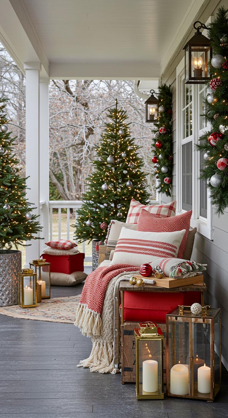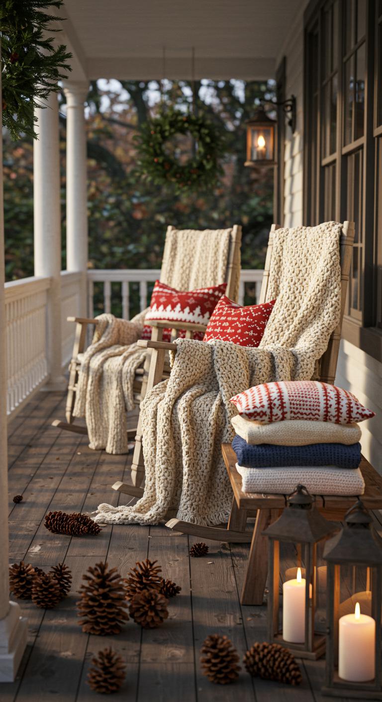 Texture creates an inviting atmosphere. Layer chunky knit blankets and throw pillows on your porch furniture. These elements invite guests to sit down and enjoy the warmth. Check local thrift stores or online shops for affordable, cozy blankets with festive patterns. Don’t shy away from mixing textures—pair soft, plush throws with rustic burlap for visual interest. Add some seasonal pillows featuring holiday designs. These small touches can transform your porch into a comfortable gathering spot. Add a couple of simple wooden crates for seating or as side tables.