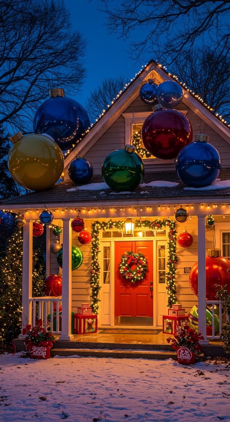 Incorporate oversized ornaments for a whimsical holiday look. Hang them from the roof or place them strategically around your porch. Large, colorful baubles create a playful vibe. Many craft stores offer affordable options, or you can DIY them using painted bowling balls or balloons. These bold decorations are sure to capture attention and encourage smiles. Combine them with smaller ornaments for a layered look that will delight guests of all ages.