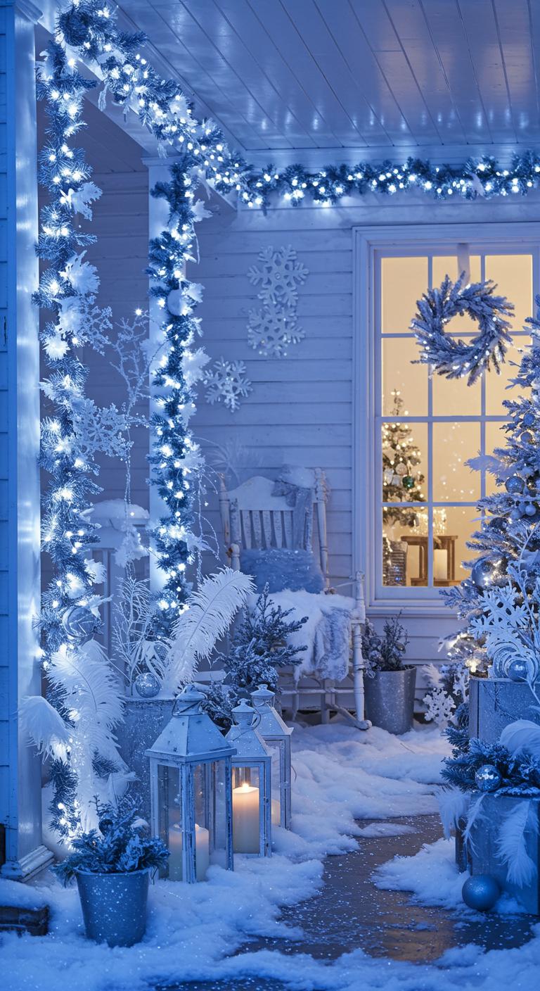 Transform your porch into a winter wonderland using white and icy blue decorations. Use white lights to mimic a soft, snowy glow. Incorporate white garlands or frosted branches for a snowy touch. Enhance the theme with delicate ornaments in shades of blue or silver. Craft your own snowflakes from paper and hang them from the porch roof. Add cozy elements — warm blankets or hot cocoa — to balance the chilly aesthetics with a warm atmosphere.