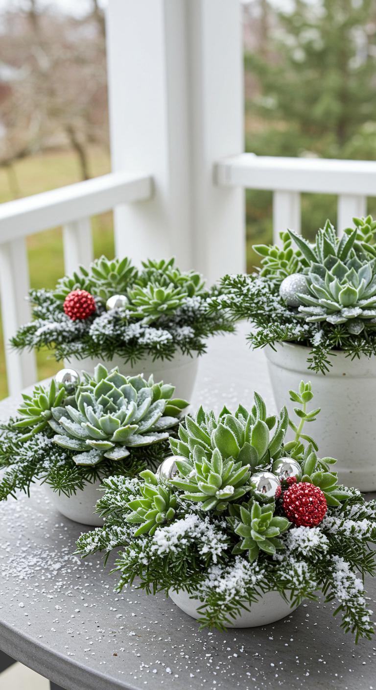 For a twist on traditional decor, consider snowy succulent arrangements. These unique centerpieces can add a modern touch. Start with your favorite succulents, which are easy to maintain. Arrange them in a rustic pot and sprinkle faux snow or glitter for a seasonal touch. You can find inexpensive succulents at local nurseries. Place these unique arrangements on tables or railings for charm. They beautifully mix natural elegance with holiday flair.