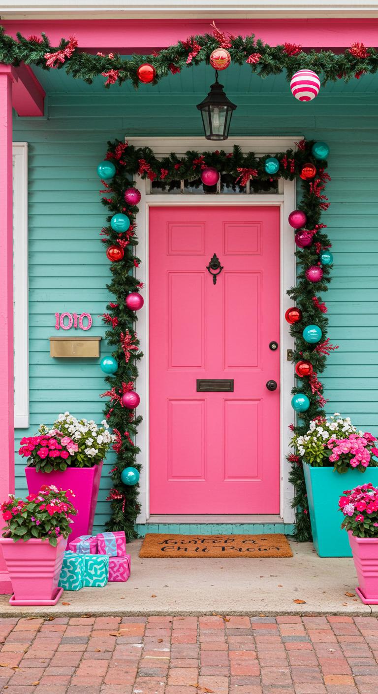 Break away from traditional color schemes! Consider incorporating playful pops of color like pink or aqua this season. Paint your front door in a bold hue for a bright, joyful statement. Pair it with multi-colored planters bursting with vibrant flowers or ornaments. Use spray paint to transform thrifted planters into colorful holiday pieces. Decorate your garlands with colorful baubles, whimsical ribbons, or eye-catching ornaments. This creates a modern twist on holiday decor that’s sure to delight guests. Don’t forget to add some color-changing lights to your porch setup for extra flair.