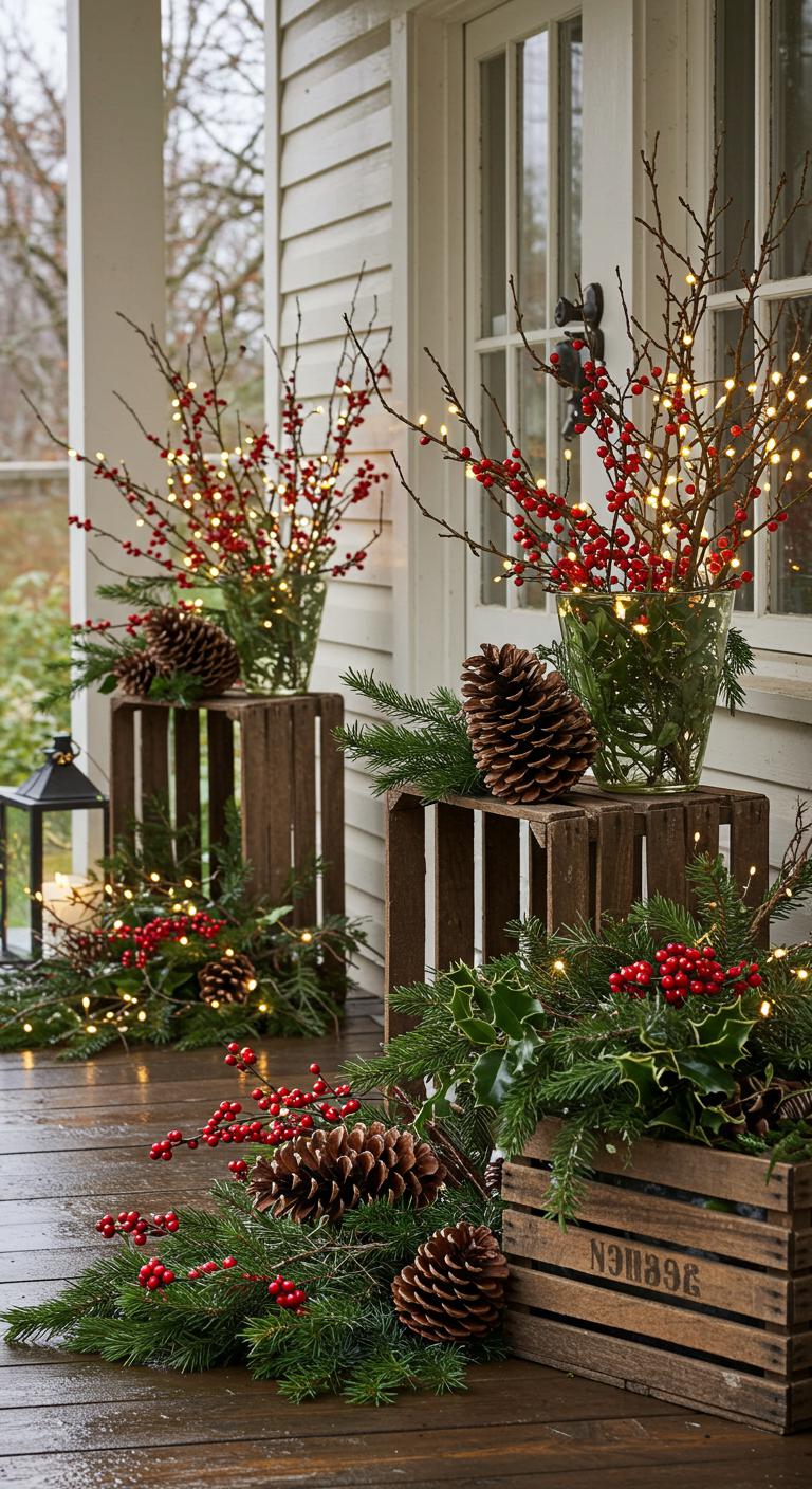 Embrace nature’s touch on your porch for a fresh look. Use pinecones, holly branches, or seasonal greenery for simple decorations. These can be easily collected from your yard or local parks. Arrange them in rustic baskets or wooden crates for a cozy display. Place a few pinecones along the railings for added charm. This naturally inspired decor is not only budget-friendly but also eco-conscious. Consider adding a few decorative stones or branches for variety.