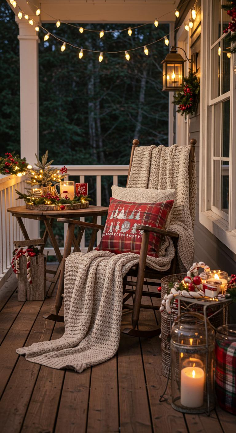Transform your porch with a rocking chair revival. Choose a comfy rocking chair as a focal point for relaxation. Drape it with cozy blankets and pillows for soft comfort. Select festive colors for your fabrics to enhance the holiday vibe. Personalize with holiday-themed pillows, like snowflakes or reindeer designs. Look for these items at local stores or even craft your own! A small side table nearby can hold drinks or snacks. This inviting setting encourages guests to sit, sip cocoa, and enjoy the season.