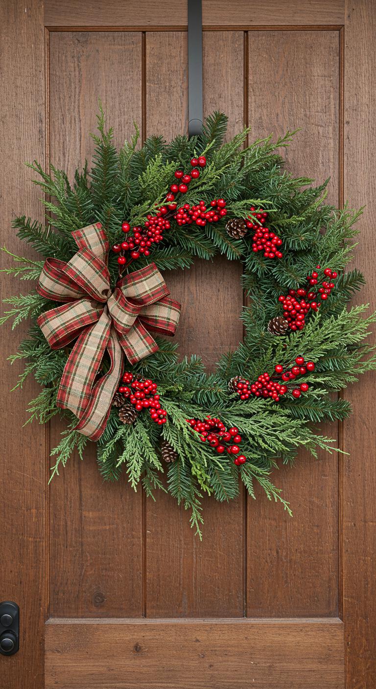 An evergreen wreath enhances your entryway with holiday spirit. You can buy one or create your own. Use fresh branches from pine or cedar, layering them for fullness. Incorporating berries adds a pop of color. For a budget-conscious project, collect foliage from your backyard or nearby woods. Wrap it in burlap or a plaid ribbon for a rustic charm. Hang it on your door or indoors for a warm touch.