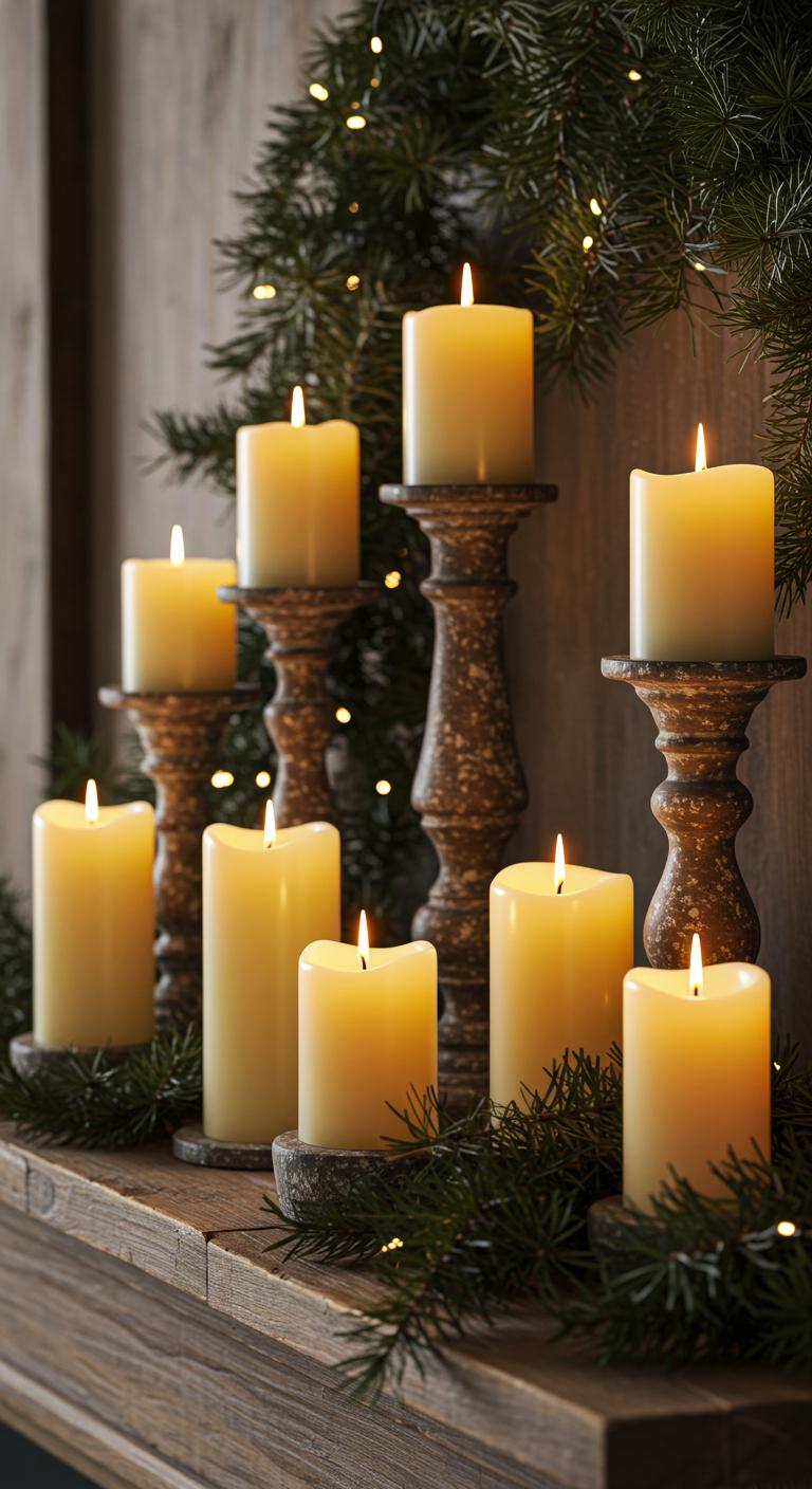 Candles are excellent for creating a cozy atmosphere. Use different sizes and shapes for visual interest, opting for rustic holders made of wood or metal. Surround them with evergreens or pinecones to enhance the holiday ambiance. Choose battery-operated candles to avoid fire hazards. This allows you to place them anywhere without worry. A few candles on the dining table add warmth for festive gatherings.