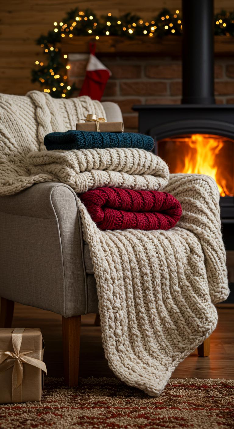 Layer knitted throws around your living spaces for warmth and texture. Look for chunky knit or plaid options that evoke a rustic vibe. You can knit them yourself or find budget-friendly options at home goods stores. Drape these over sofas or chairs to create inviting spots to relax. They also serve as great accents during festive gatherings.