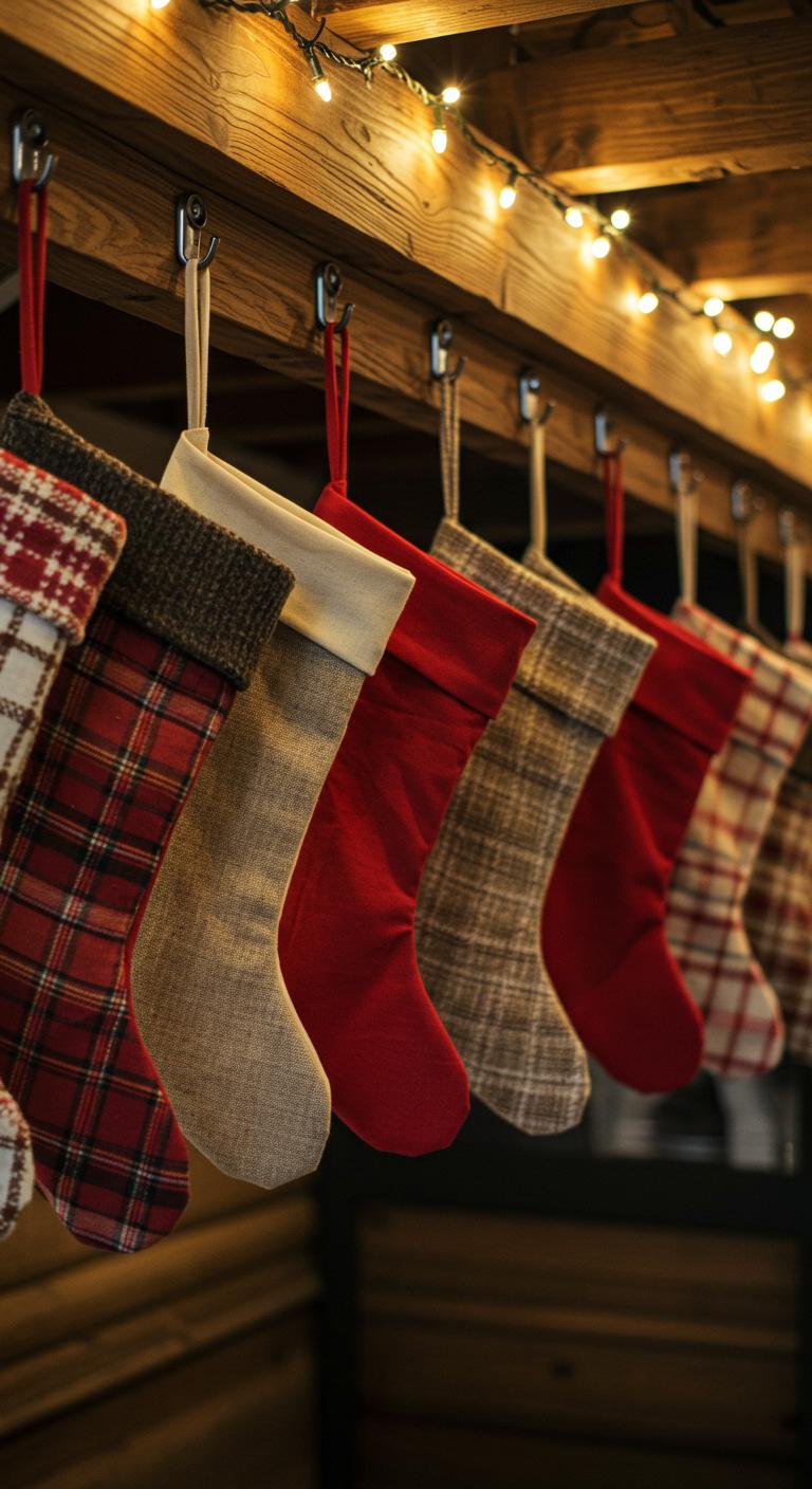 Hang rustic stockings for a festive touch. Opt for fabrics like burlap or knit to evoke a cozy feel. You can personalize them by applying initials or festive motifs. This can be done easily with fabric paint or iron-on patches. Make these yourself for a personal touch or find them at local craft fairs or thrift shops. They look lovely on mantels or walls, serving as a festive invitation for holiday surprises.