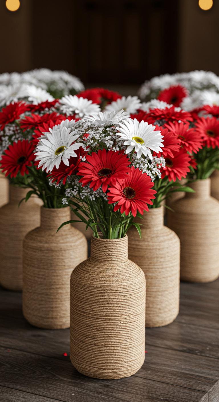 Transform any jar or vase into rustic décor by wrapping it in twine. Start at the bottom and wrap the twine tightly, securing with hot glue as you go. Fill your newly wrapped vase with fresh flowers, evergreen sprigs, or even simple branches. Each vase can reflect your unique style, and this project is simple and low-cost. Consider using empty pickle jars or old glass bottles for a frugal approach that adds charm to your festive setup.