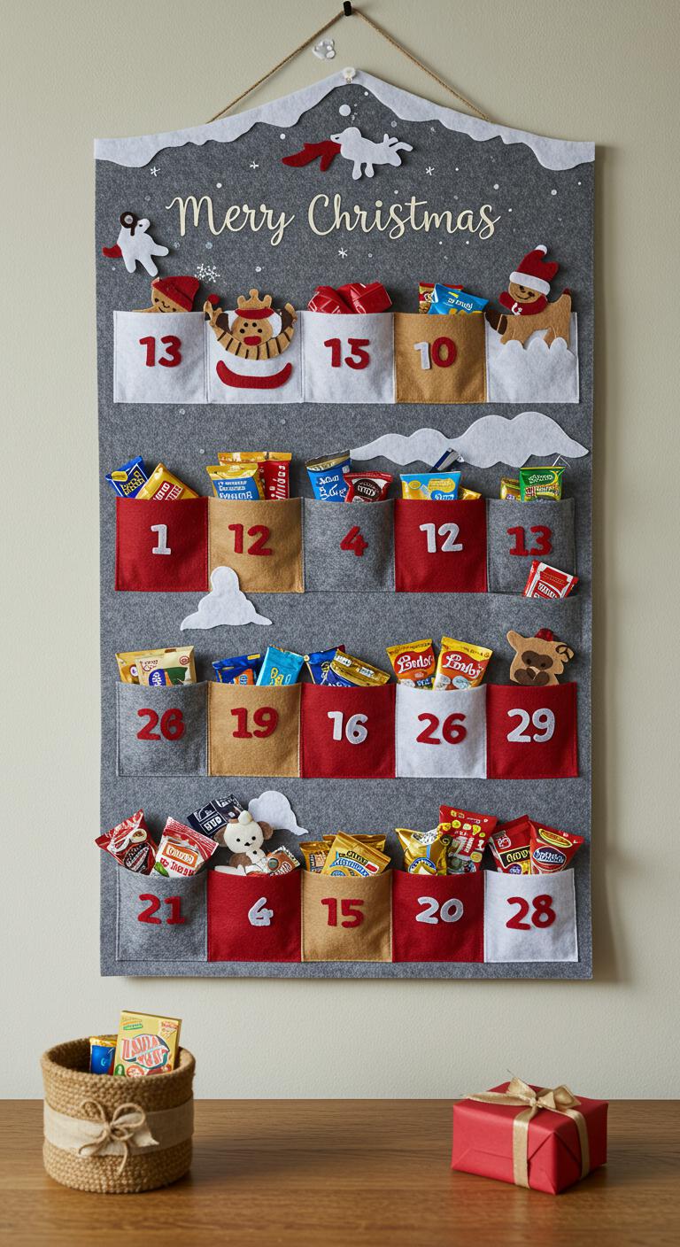 Create a felt advent calendar as a fun way to count down to Christmas. Cut out pockets from felt in various colors and shapes. Sew or glue them onto a larger piece of felt, arranging them in a grid. Fill each pocket with small treats, notes, or decorations. This festive project brings excitement and surprise each day leading up to the holiday. Plus, it saves money and can be reused year after year.