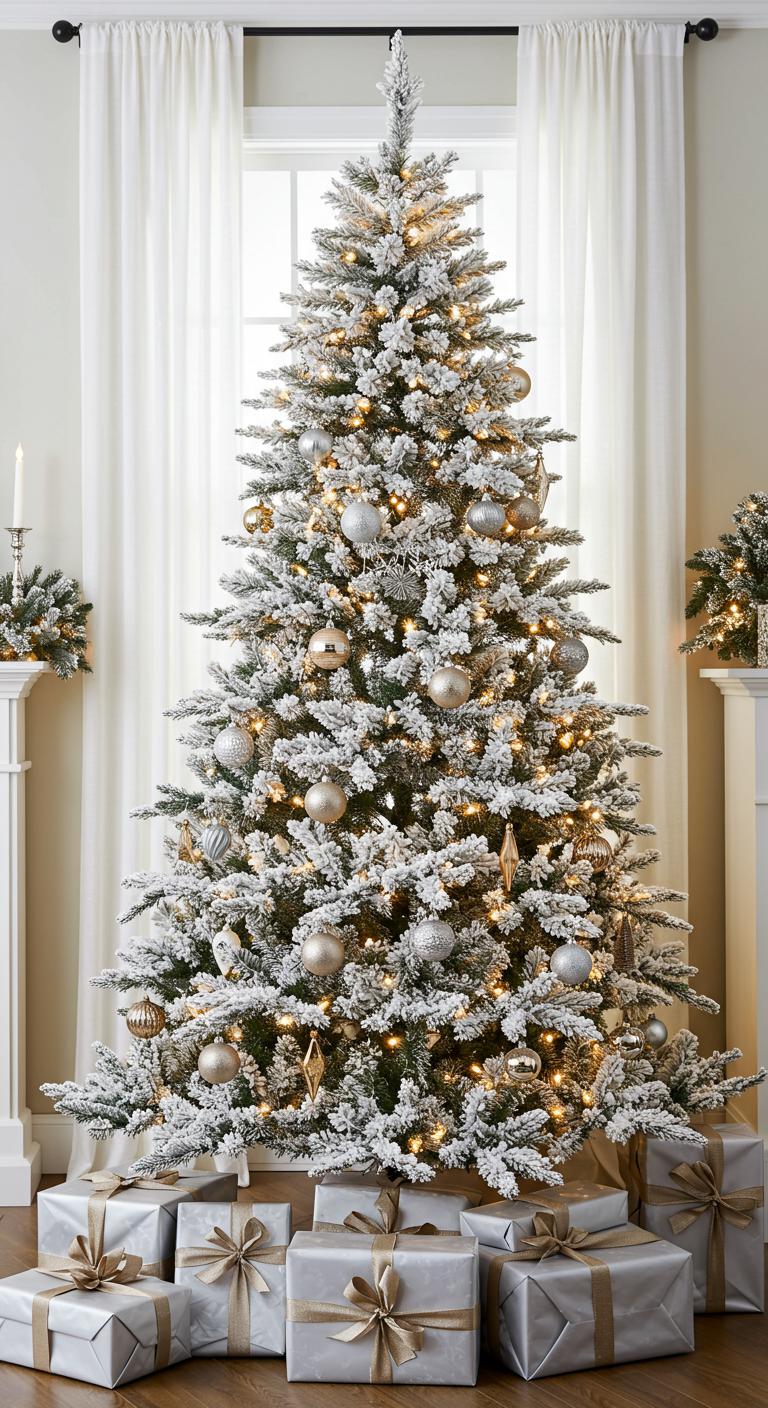 A flocked tree captures the essence of a snowy winter. The white or cream accents create an ethereal look. This style pairs perfectly with natural twinkle lights for added warmth. Budget-friendly tip: If you’re feeling crafty, you can DIY your own flocking using simple materials like white spray paint and Epsom salt. Simply spray the branches lightly and sprinkle the salt to simulate snow.