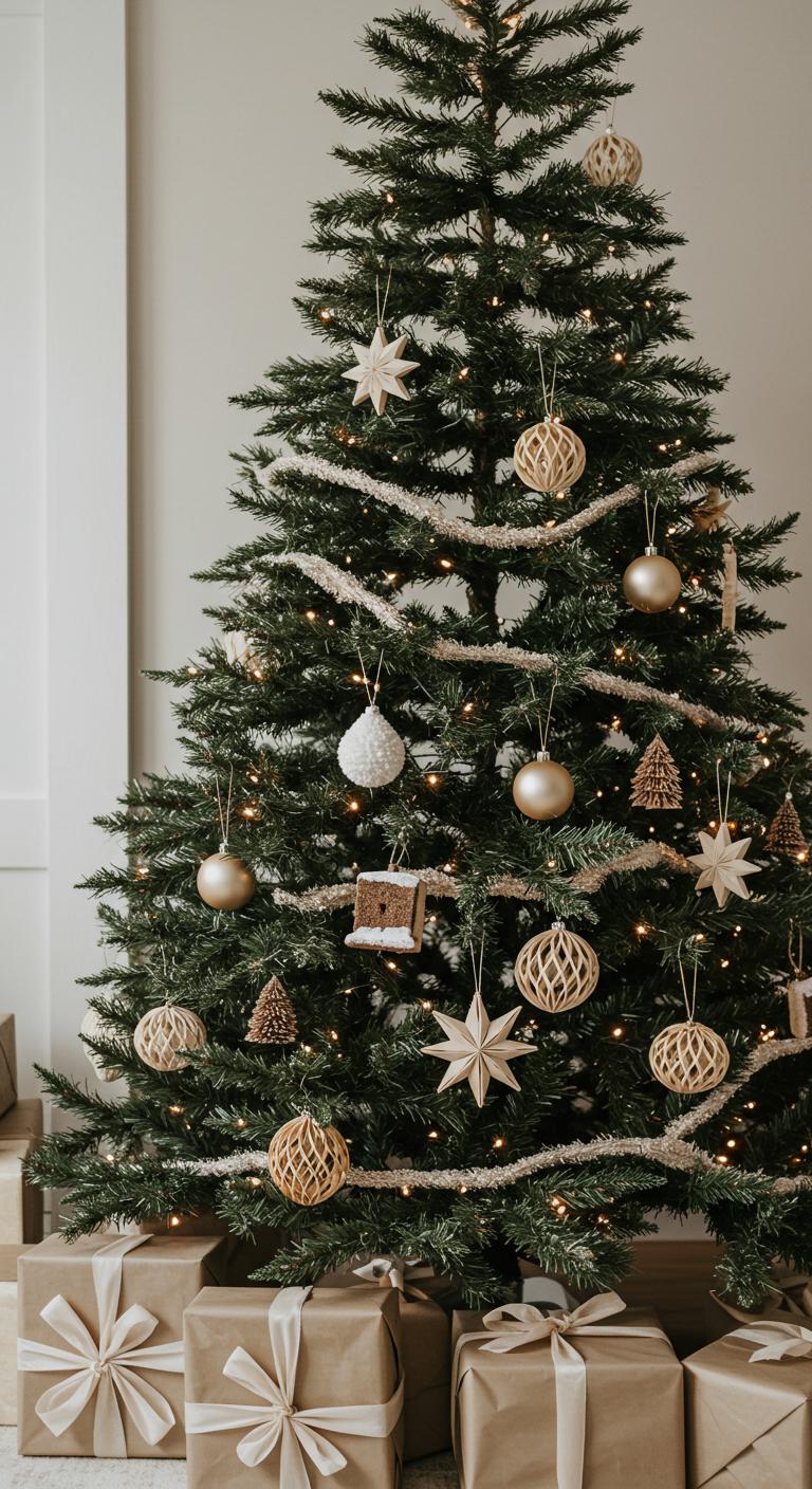 Embrace minimalism with a tree that focuses on simplicity. Quality over quantity reigns supreme here. Use just a handful of carefully chosen ornaments. Think white baubles or natural wood finishes. DIY tip: You could also use simple, white paper for handmade ornaments. Lightweight and easy to hang, they can add a personal touch without overwhelming the aesthetic.