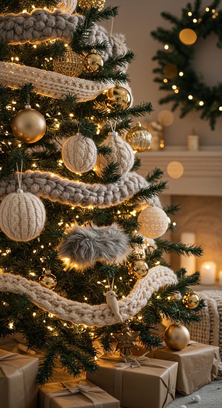 Knitted and faux fur decorations add comforting warmth to your tree. Soft textures make it feel inviting. Incorporate knit stockings or faux fur accents for a cozy effect. DIY idea: Repurpose old sweaters by cutting them into festive shapes. Your tree will look stylish while keeping things low-cost and eco-friendly.