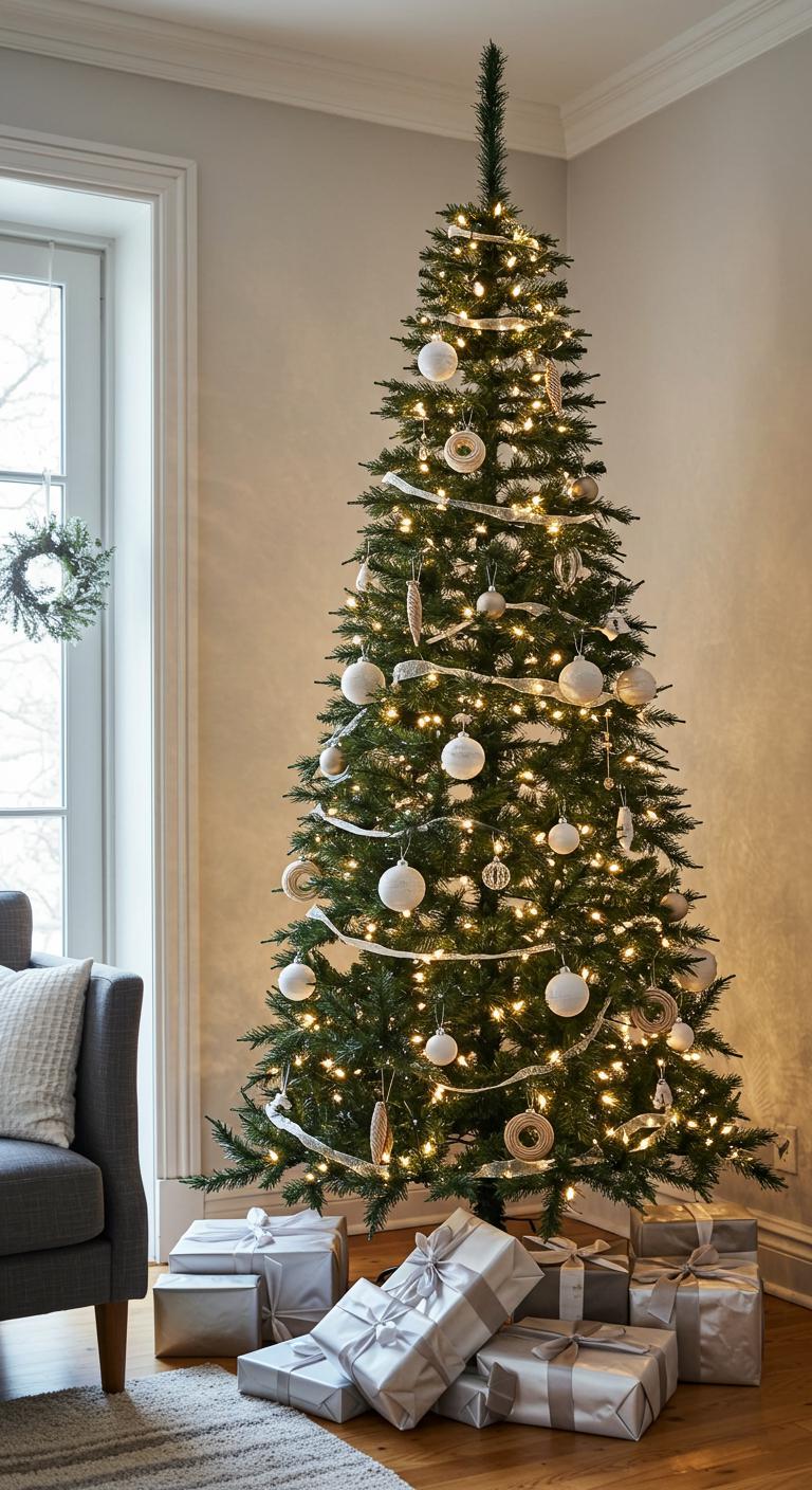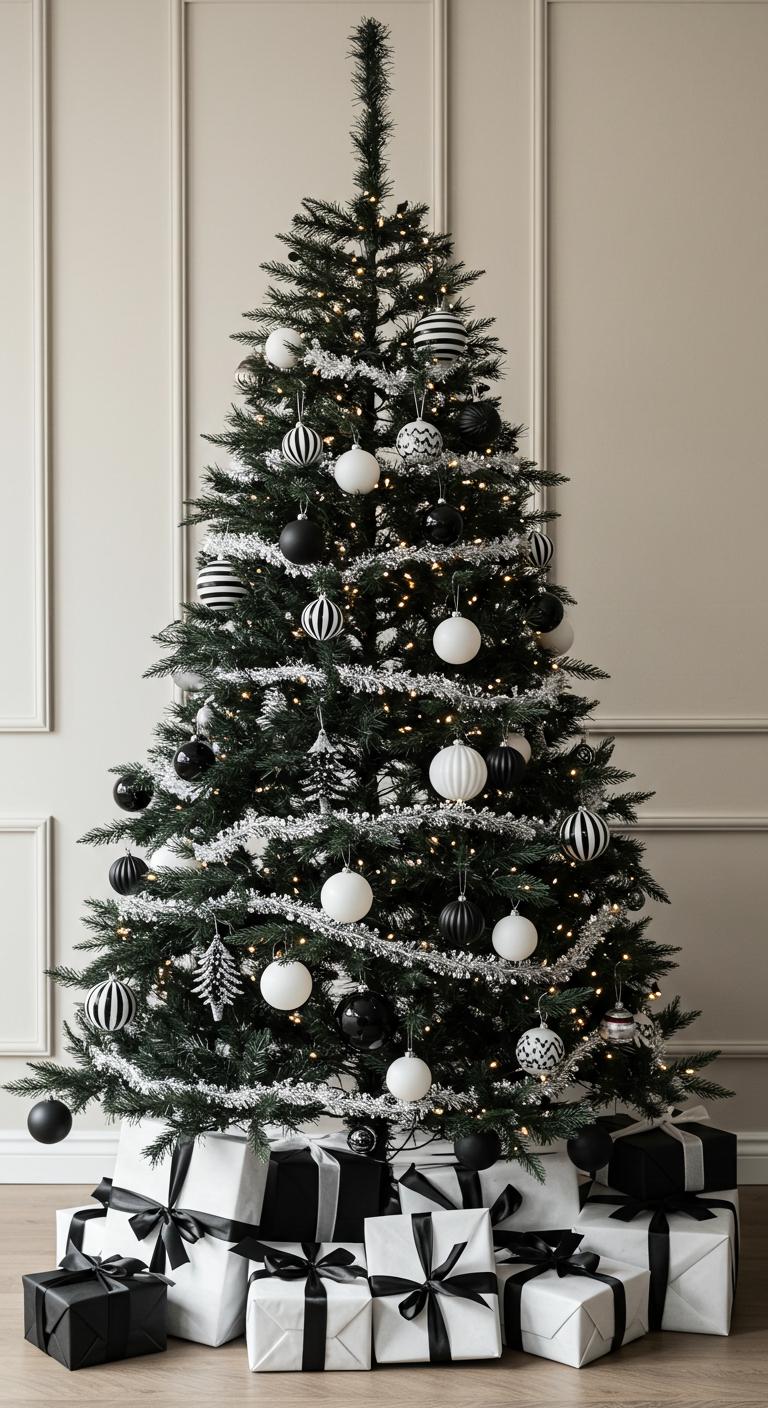 A black and white tree adds a modern touch to your holiday decor. This striking contrast looks beautiful against soft green elements. Incorporate textured ornaments, such as knitted black stockings or white feather accents, to enhance visual interest. DIY idea: Create your own black and white ornaments by painting glass baubles. Customize them to fit your unique theme, making them an expression of your style.