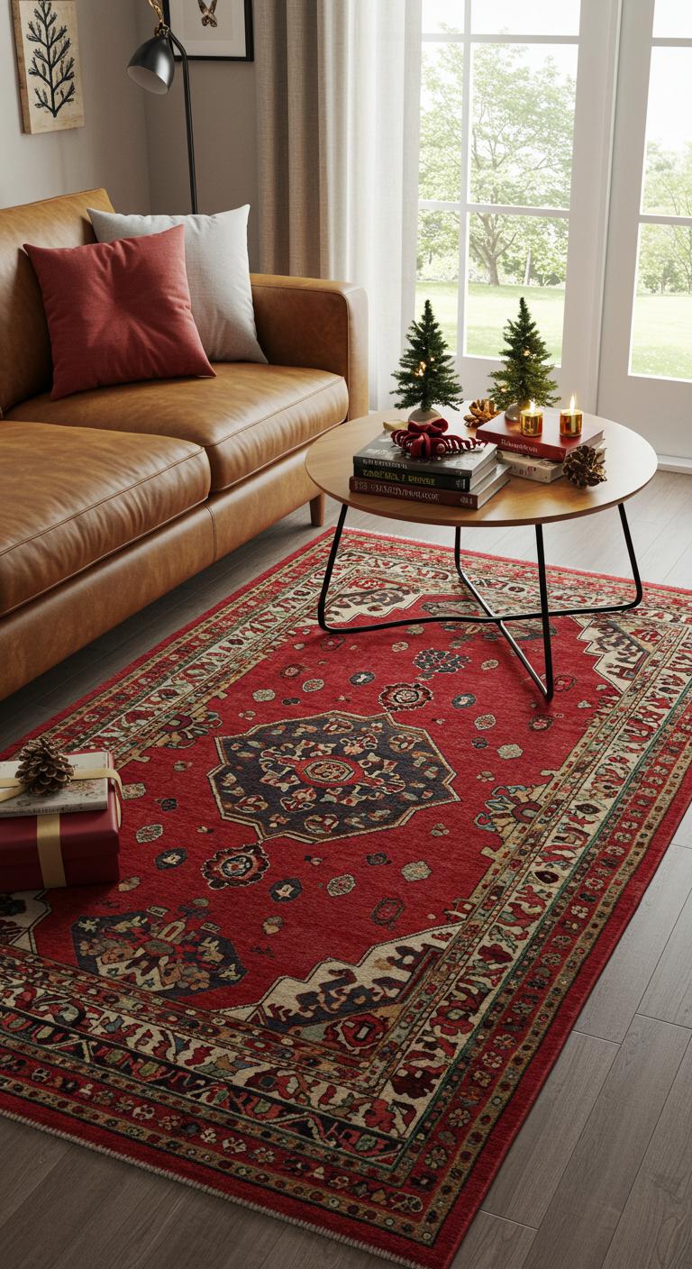 Brighten your space with a cheerful floor rug. Using red or patterned rugs can make your home feel warm instantly. They help define areas and add homey charm. Look for options that fit your aesthetic within budget. Rummage through discount stores or consider a DIY approach by painting an old rug! Use stencils for precise designs. A festive rug not only enhances decor, but serves functional purposes too.