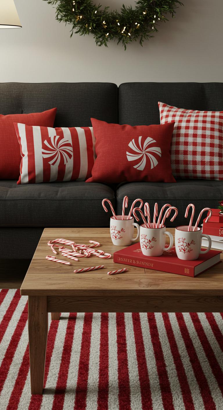 Incorporating candy cane stripes into your decor brings a playful touch to your space. Think pillows, table runners, or festive throws. The combination of red and white creates a vibrant yet cozy theme. It’s endlessly cheerful and appealing for small home aesthetics. DIY your candy cane stripe decor by using fabric paint on plain cushions. Follow simple stripe designs to get a custom look without spending much. Pair these pieces with solid red or white accents to maintain harmony.