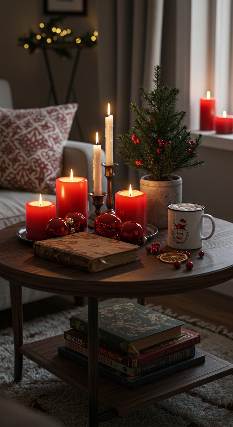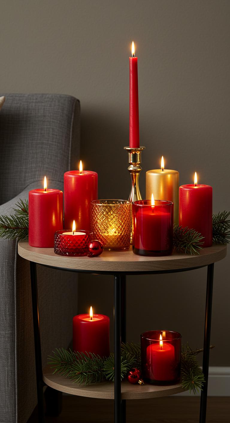 Candle displays bring warmth and coziness to small spaces. Use an array of red candles in different heights and sizes for visual interest. Place them on your dining table or a side table. Varying heights and colors create a dramatic effect. Try mixing glittery and matte finishes for an upscale feel. Use thrifted candleholders to keep costs down. For a unique twist, decorate plain candles with seasonal ribbons!
