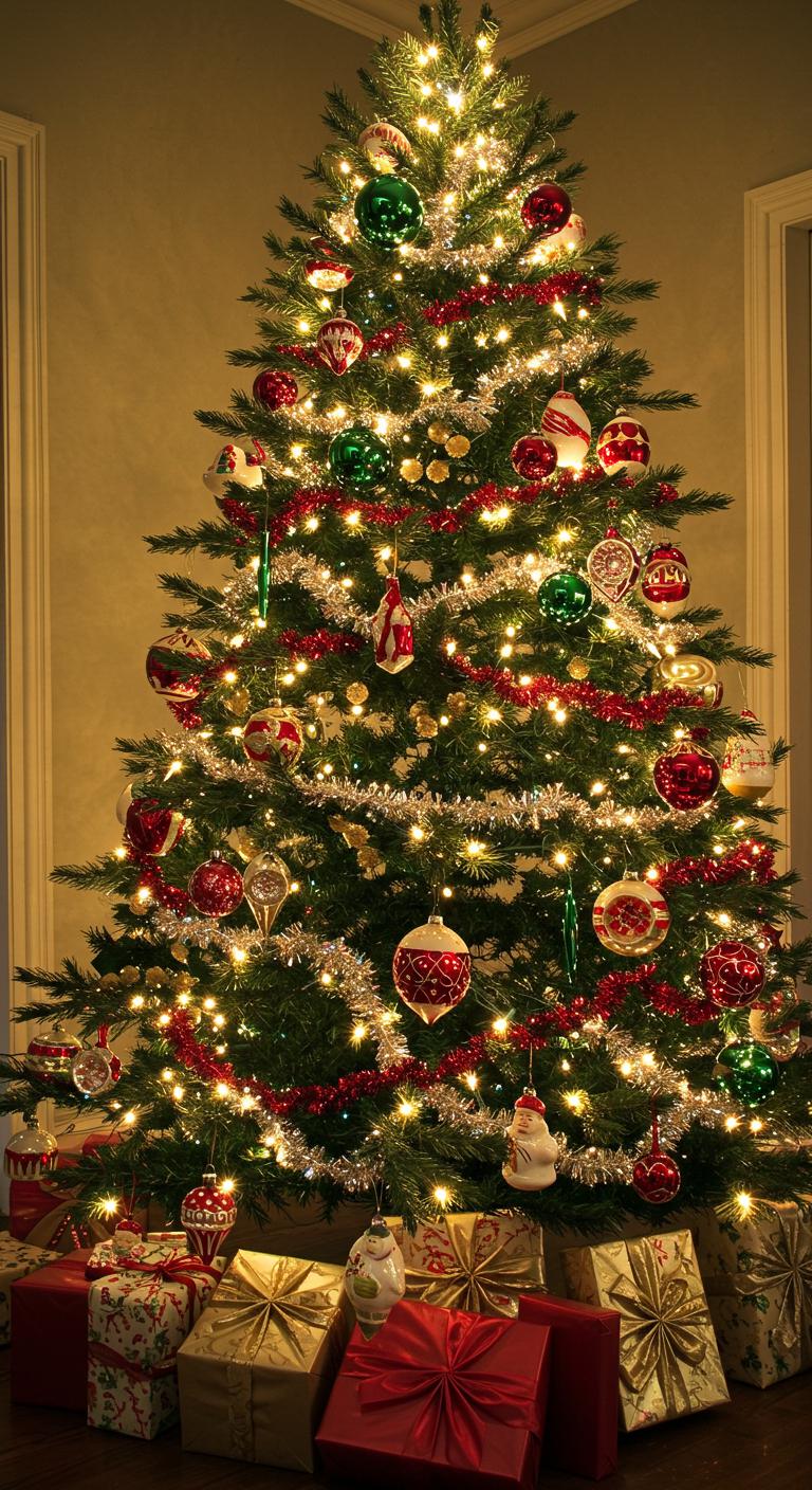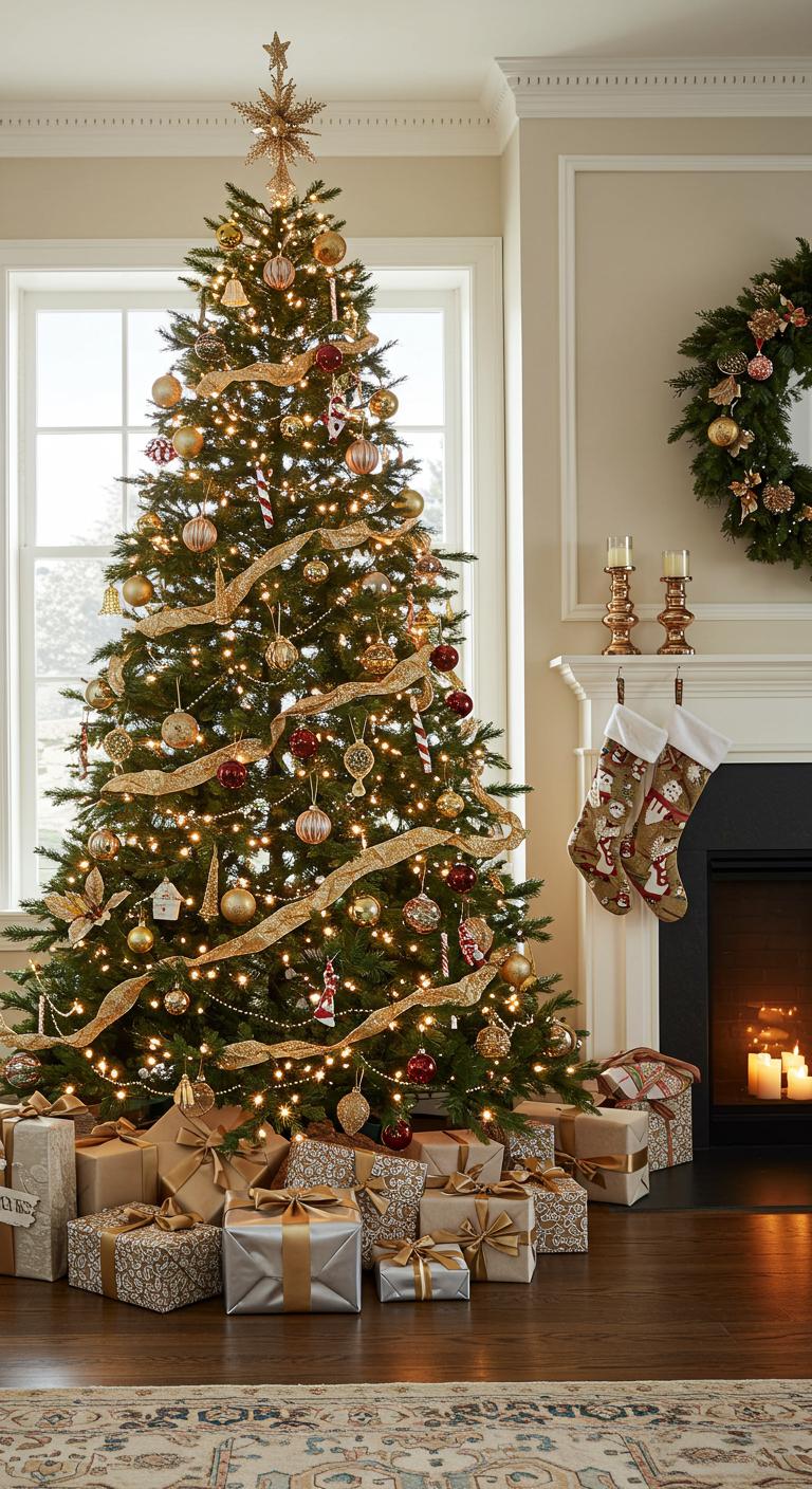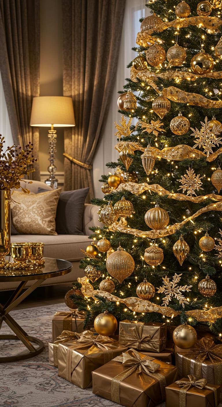 Elevate your tree with richly colored metallic ornaments. Pair them with soft white lights for an enchanting glow. For DIY elements, create your own metallic garland from gold craft paper or plastic ornaments.