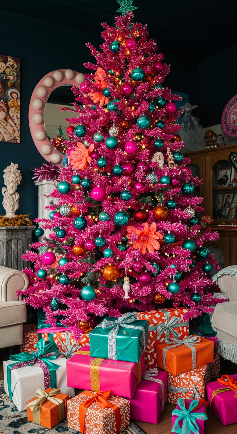 With the resurgence of bold colors, this theme turns your tree into a vibrant focal point. Think bright pinks, teals, and sunny yellows! This eye-catching approach is all about fun and playfulness.