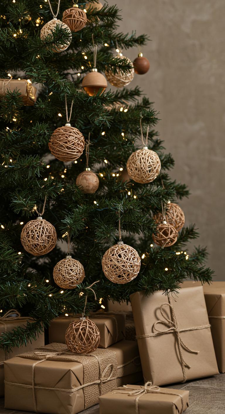 Opt for ornaments crafted from recycled items, or try making your own from wood or natural fibers. Use the color palette of earthy greens and browns to resonate with the theme.