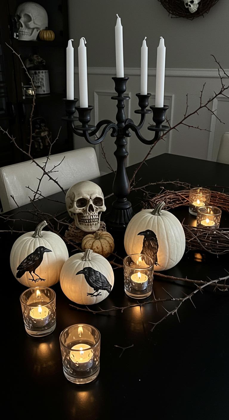 Surrounding it, white pumpkins painted with hand-drawn ravens add a whimsical touch, while thorny branches and a twig wreath featuring a skull weave an intricate backdrop.