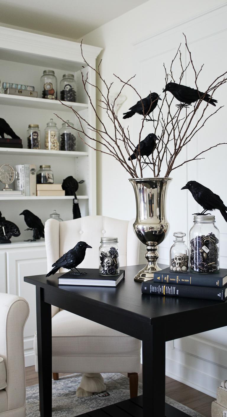 A striking contrast to the dark elegance of the Halloween-themed black table, the crow decor in a white room creates a mesmerizing blend of sophistication and spookiness. The crow aesthetics shine against a backdrop of pristine white decor, where a white bookshelf cradles plain books alongside jars filled with ethereal treasures. A silver vase holds gnarled twigs, each adorned with perched crows that command attention. Faux crows rest on nearby furniture, embodying the theme’s consistency. This innovative approach transforms a mundane space into a hauntingly beautiful haven, perfectly balancing elegance and eerie charm, inviting all to experience this enchanting Halloween ambiance.