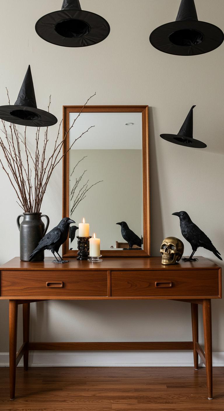 Transforming an ordinary space into a mesmerizing Halloween spectacle, a mid-century table adorned with crows brings a touch of whimsy and elegance.