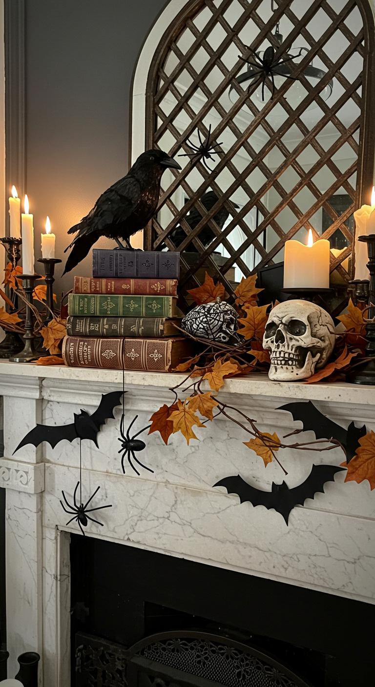 Striking mantel arrangements might feature an antique book stack topped with a menacing crow or a gothic skull, while spooky accents like delicate spiders and paper bats dance above.